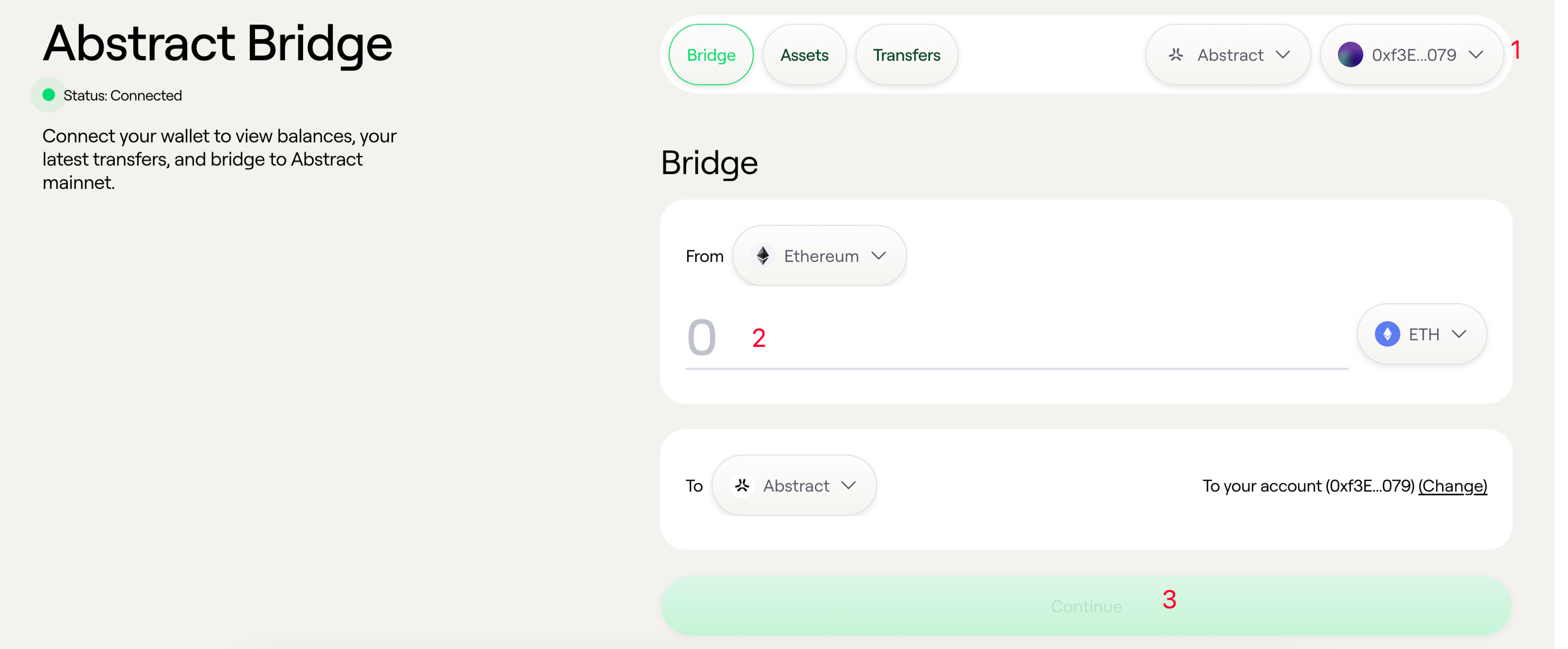 1. Bắt đầu bằng cách chuyển ETH vào mạng Abstract. Bay vô trang bridge (các tùy chọn rẻ hơn: 1, 2), kết nối ví của bạn và gửi token: