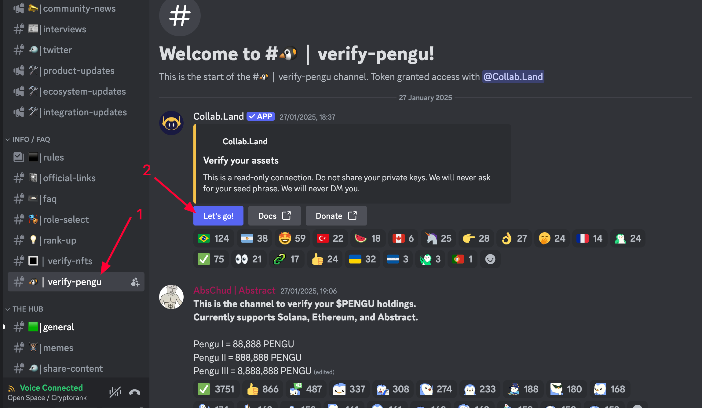 2. Mở kênh #verify-pengu (hoặc #verify-nfts nếu bạn là người nắm giữ NFT) và nhấp vào Let's go: