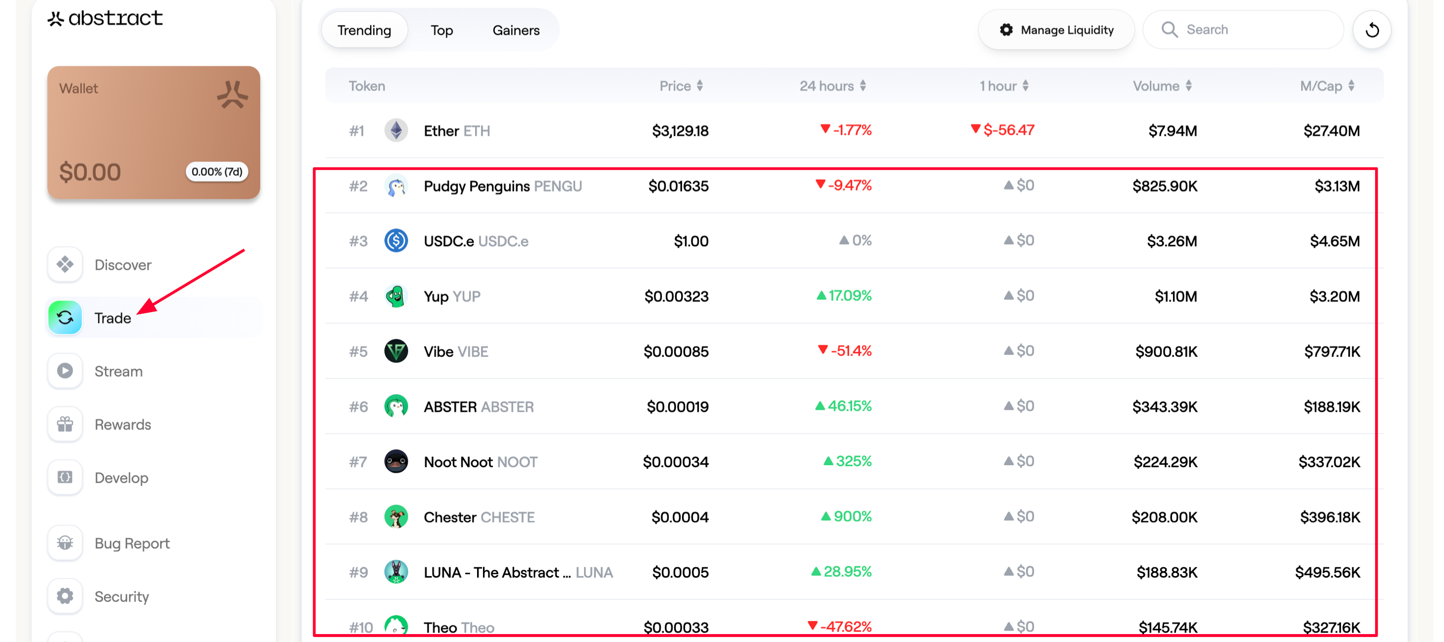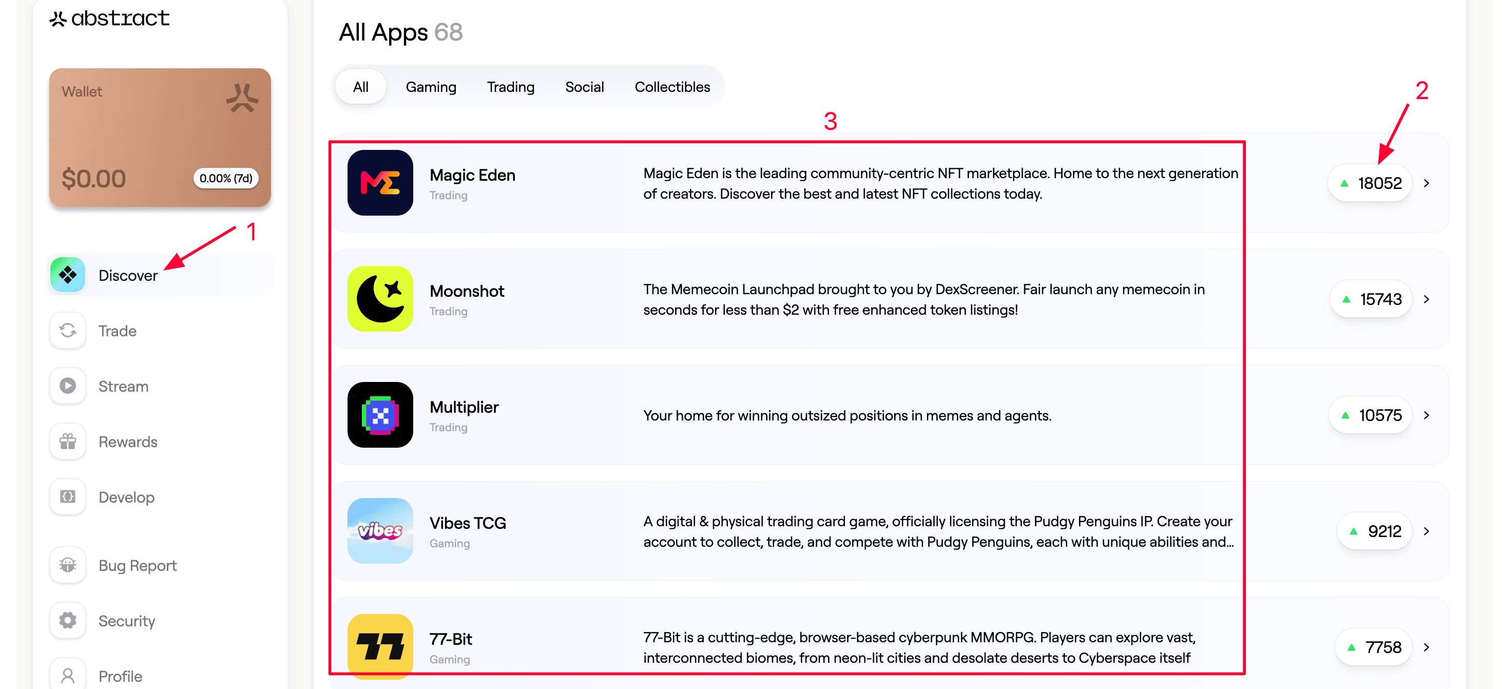 6. Bỏ phiếu cho các dự án từ hệ sinh thái Abstract, tương tác với chúng (chơi game, thực hiện các cú swap hoặc mint NFT) trên tab Discover. Bạn cũng có thể xem các buổi phát trực tiếp của những người dùng khác tại đây