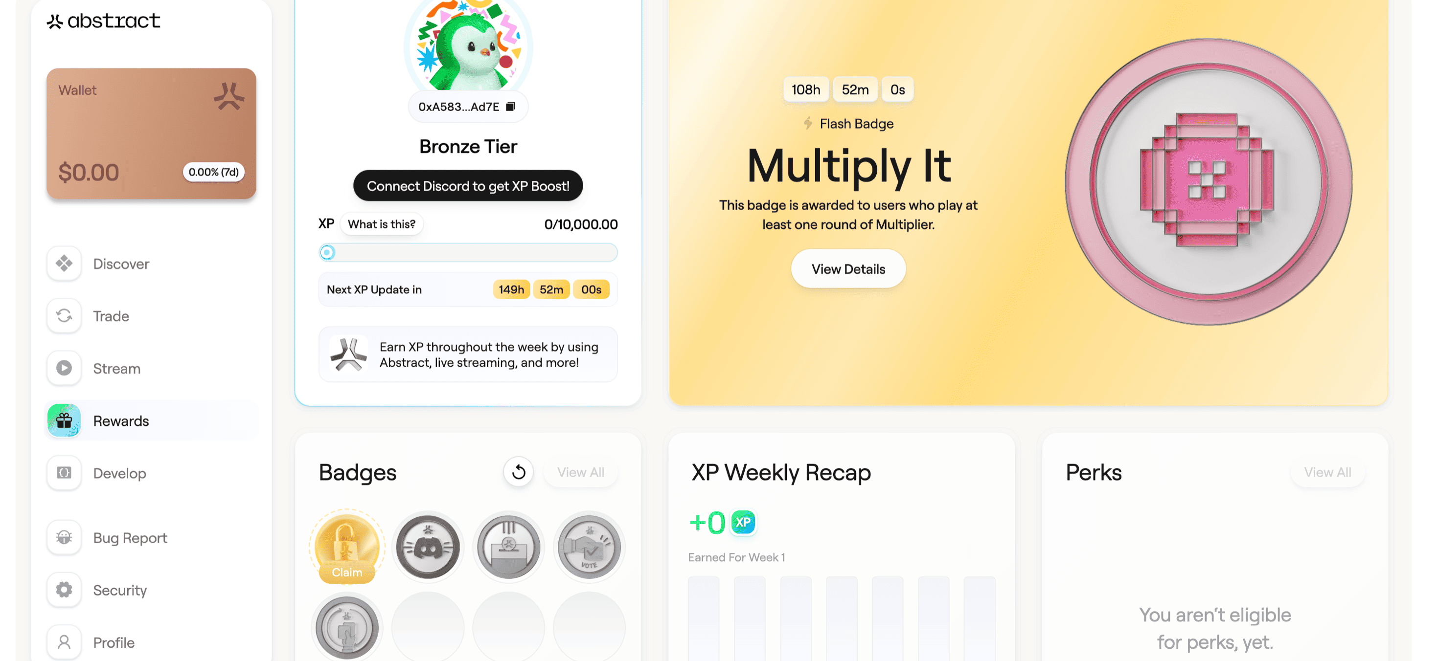 Abstract đã ra mắt mạng chính! Kiếm XP và huy hiệu bằng cách thực hiện các hành động khác nhau trên mạng chính (bridge, swap, mint tên miền). Sau khi đăng ký trên nền tảng, bạn sẽ nhận được ví Abstract mới của mình, ví này sẽ được liên kết với ví chính của bạn.