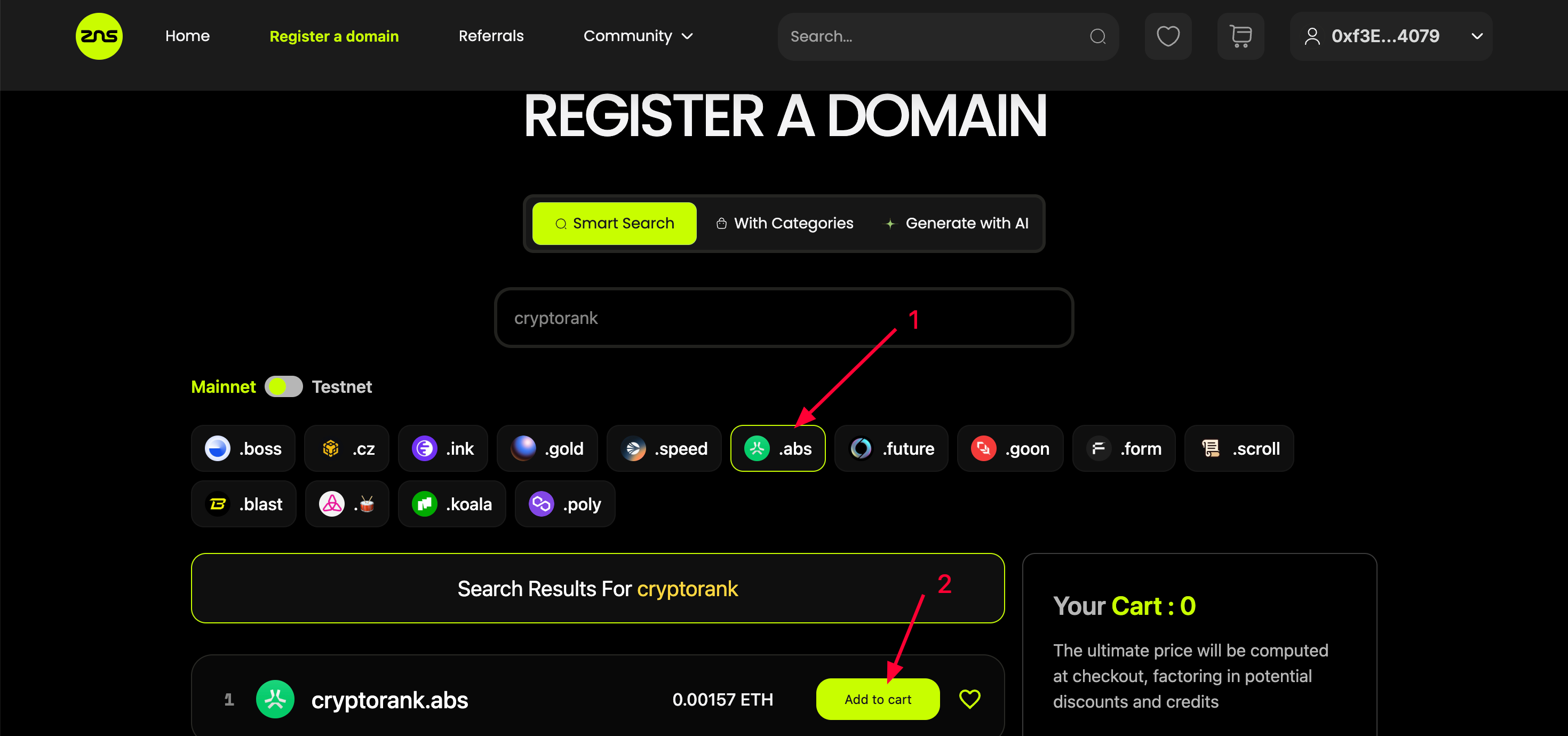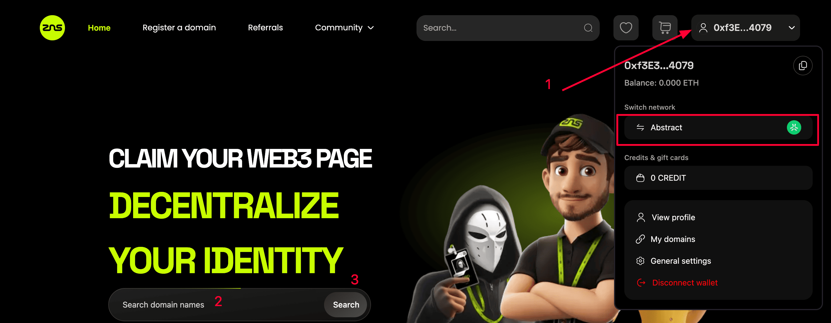 1. Bay vô website và kết nối ví của bạn trên mạng Abstract. Sau đó nhập tên miền mong muốn và nhấp vào Tìm kiếm: