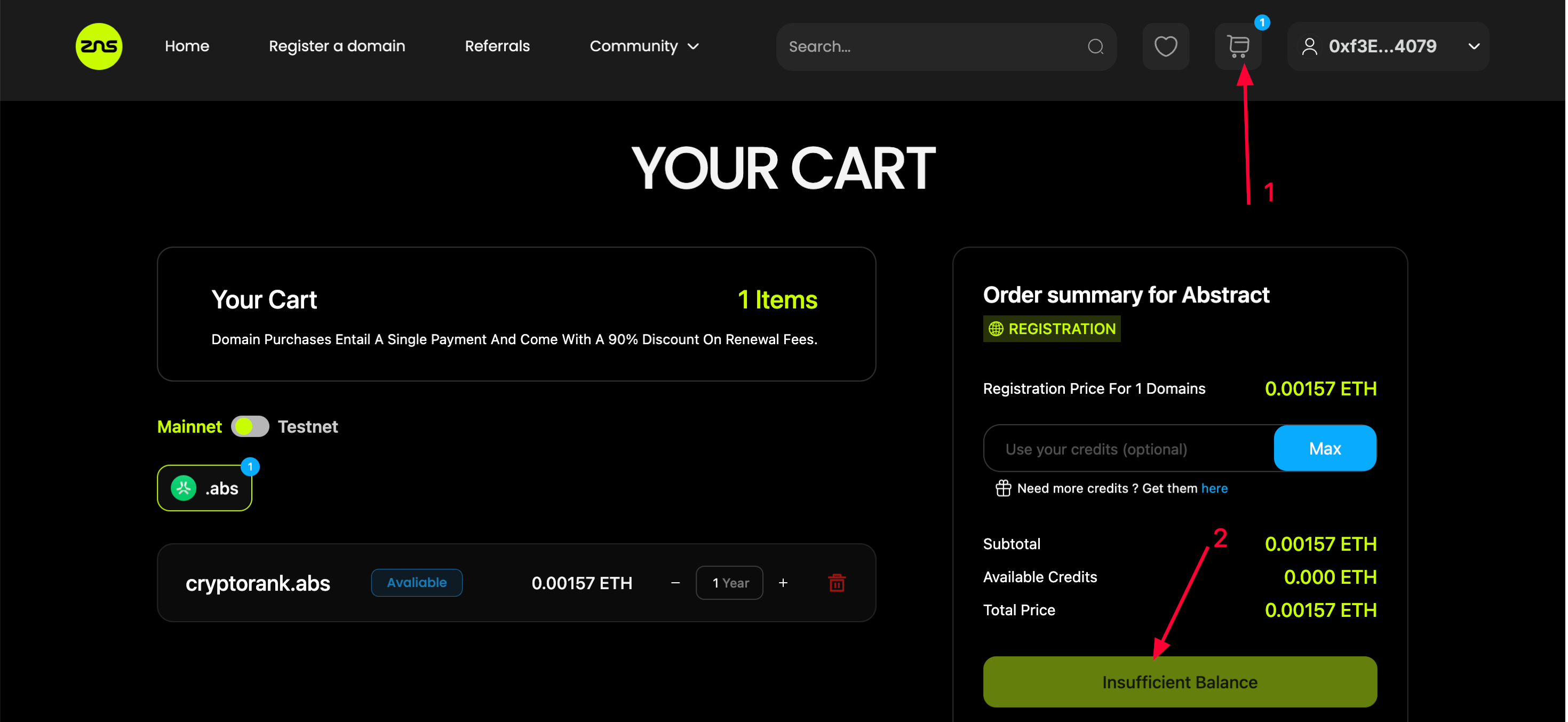 3. Mở giỏ hàng và mint tên miền trong một năm: