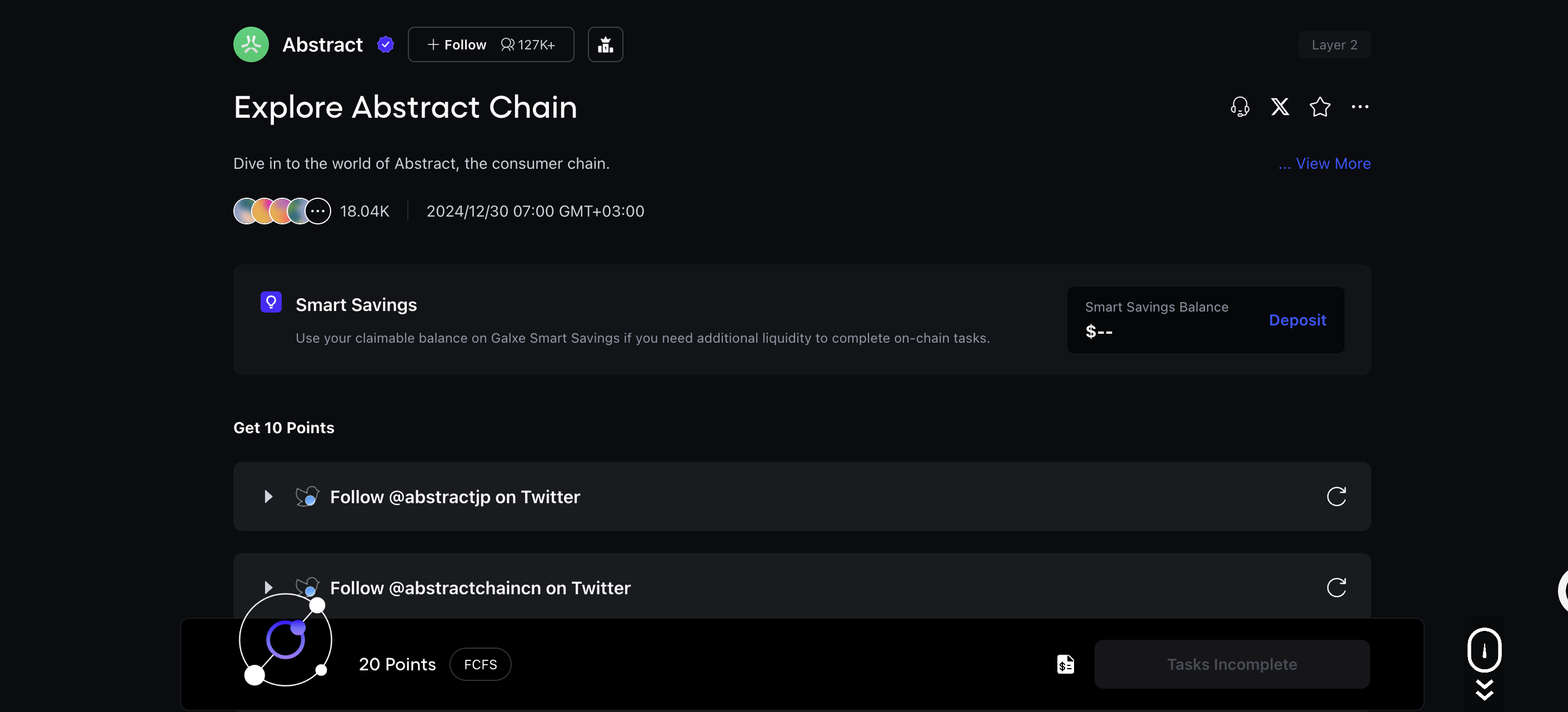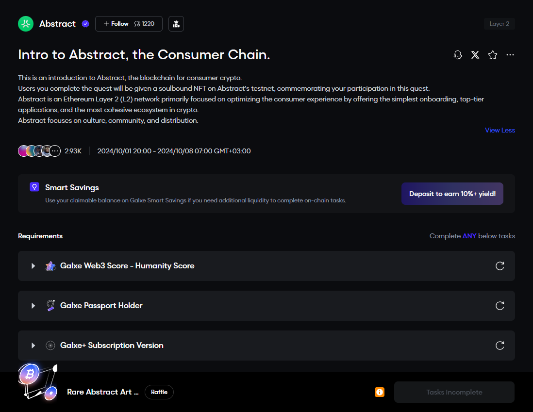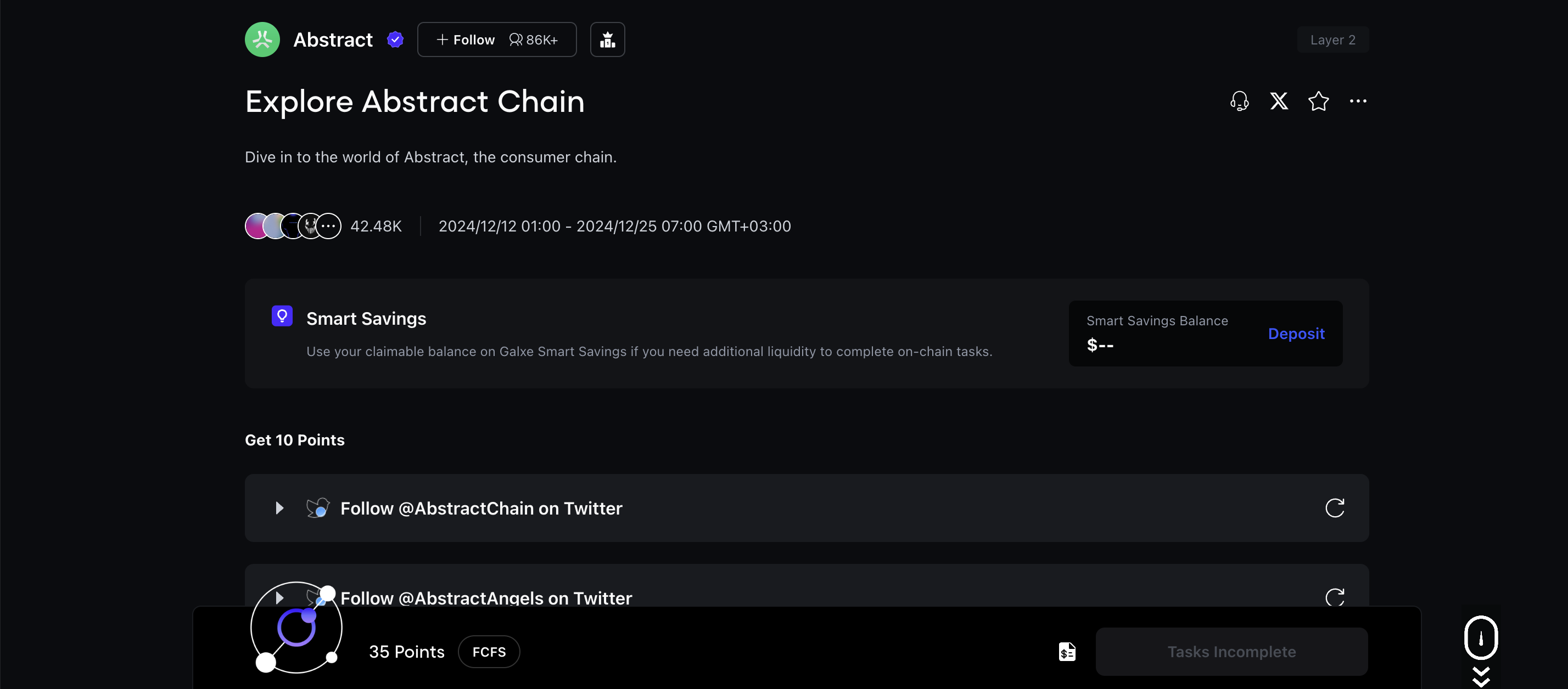 Abstract has launched a new campaign on Galxe! We can complete simple tasks and get 35 points.