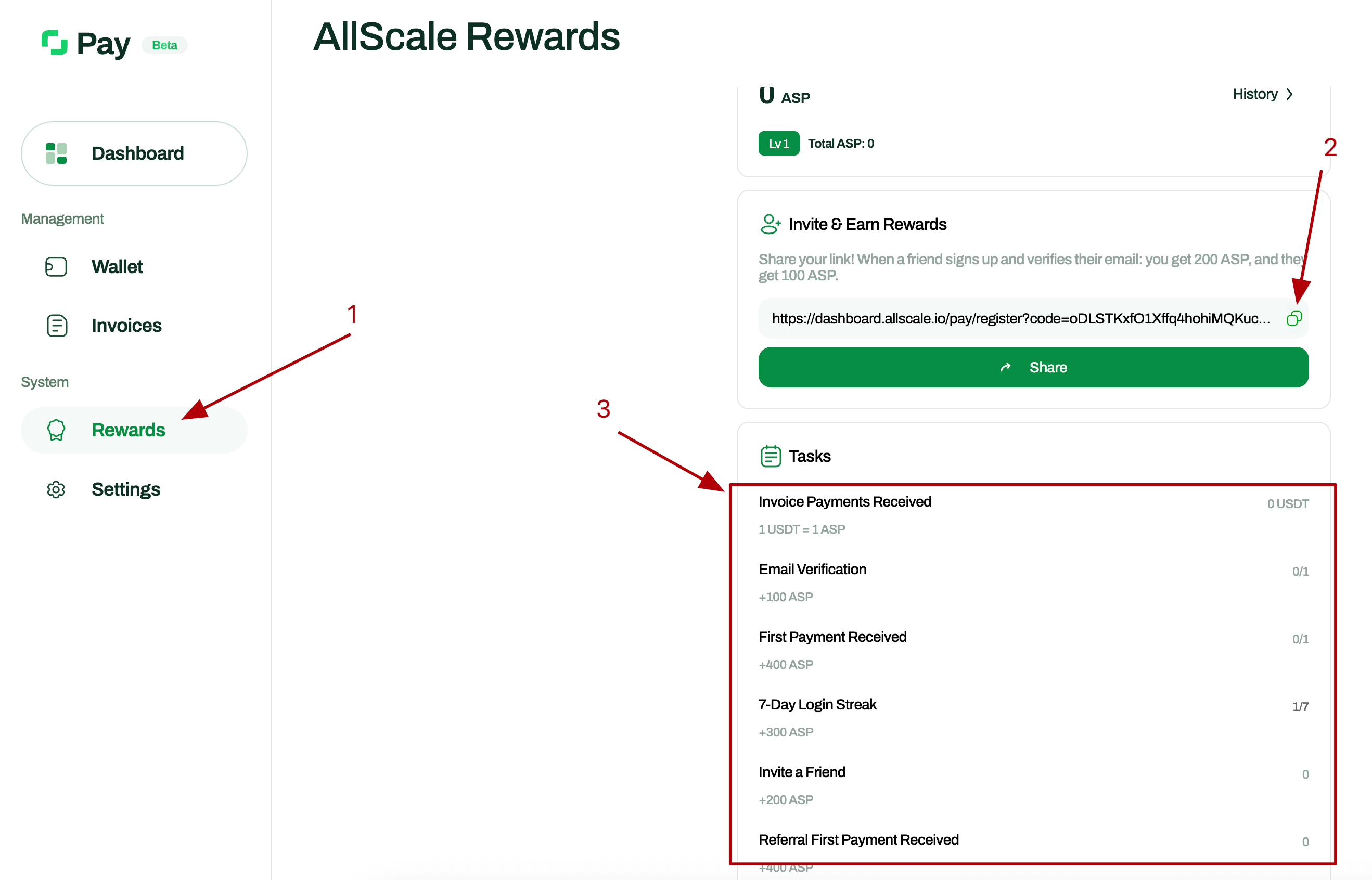 4. Open the Rewards tab, complete tasks, and invite friends: