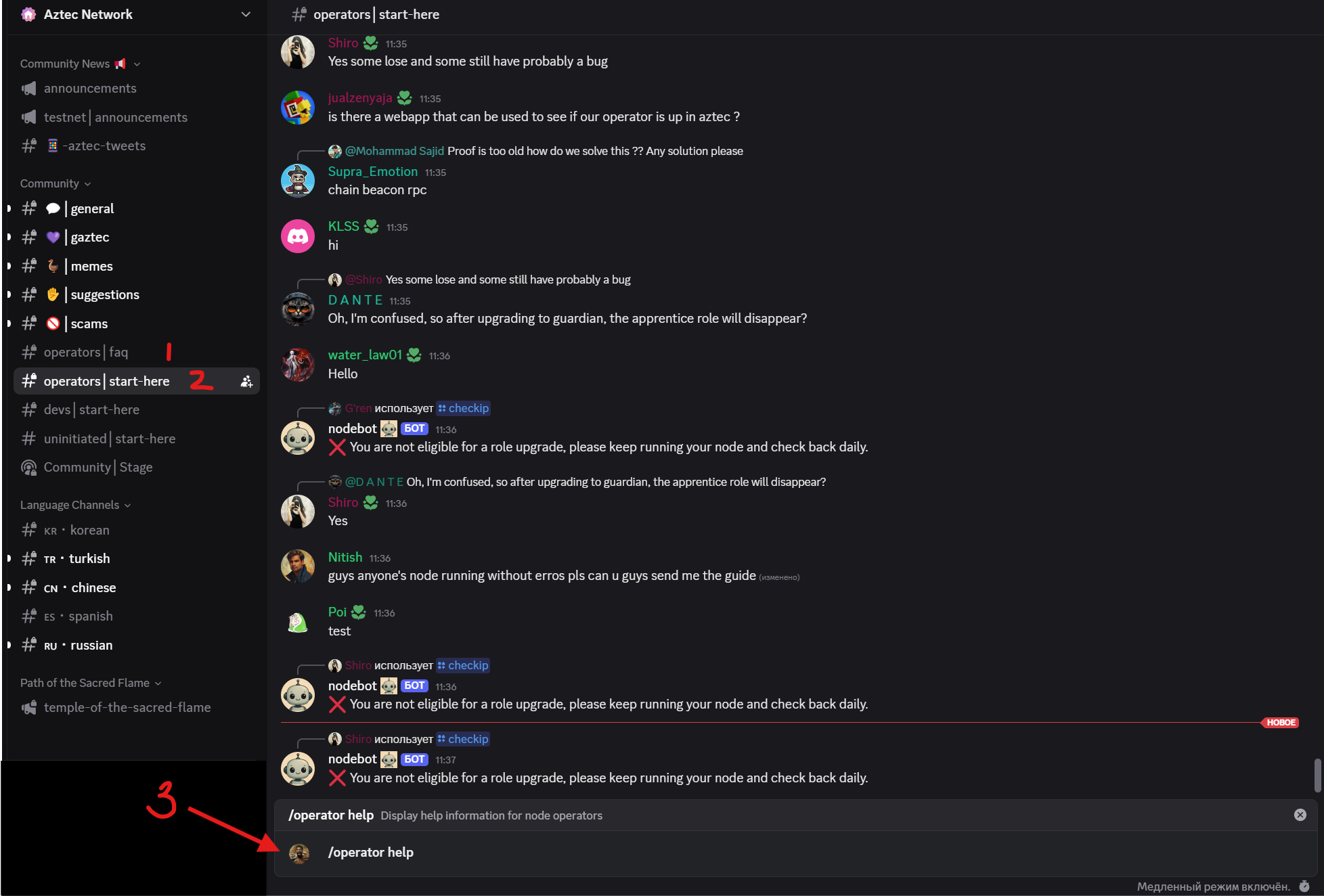2. Nghiên cứu thông tin trong kênh operators/faq. Vào kênh operators/start-here và nhập lệnh "/operators help". Làm theo hướng dẫn để xác minh rằng Node đang chạy ở phía bạn.