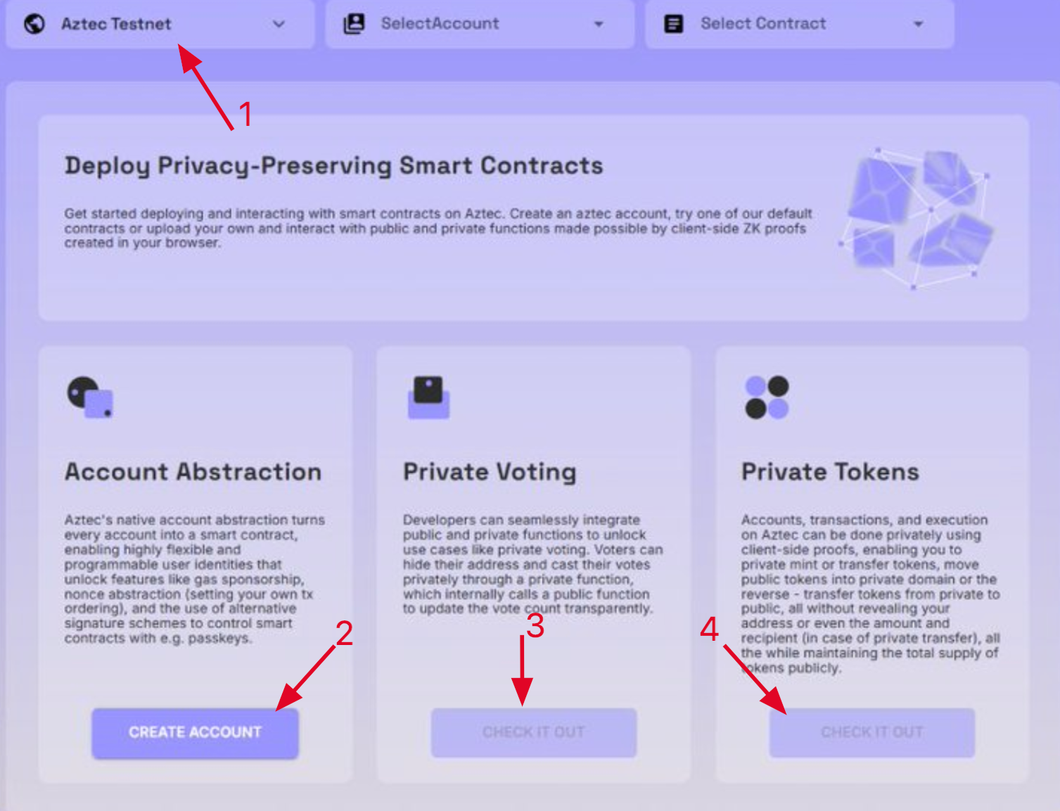 1. Vào trang web, chọn Aztec Testnet và thử nghiệm tất cả các hành động có sẵn (trang web có thể tạm thời ngừng hoạt động):