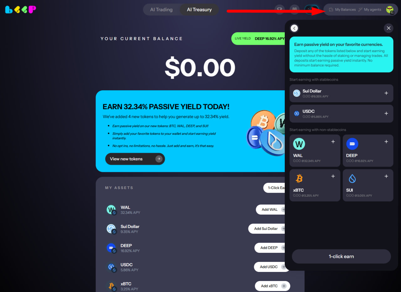1. Go to the platform and connect your wallet. Click the "My Balances" button and make a deposit of at least $10