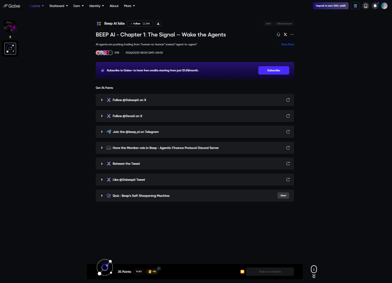 Beep has announced the launch of The Odyssey campaign on the Galxe platform. You can complete tasks in the first chapter to earn Odyssey points and qualify for future rewards