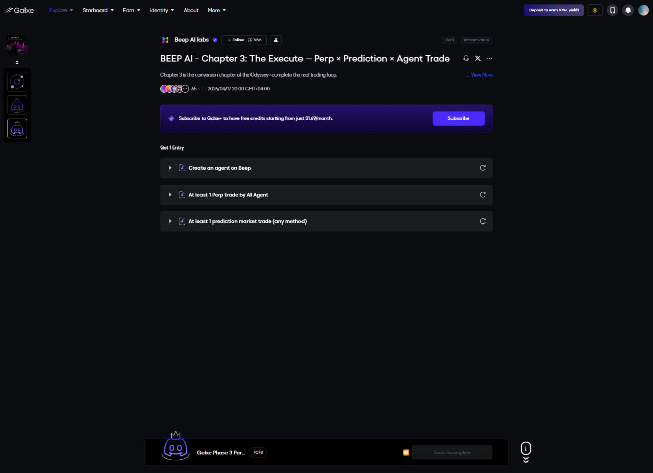 The BEEP AI - Chapter 3 campaign is now available on the Galxe platform. You can complete tasks by creating an agent, trading with it on the Perp markets, and placing a single bet on the prediction markets to earn the Discord role of Galxe Phase 3 Participant.