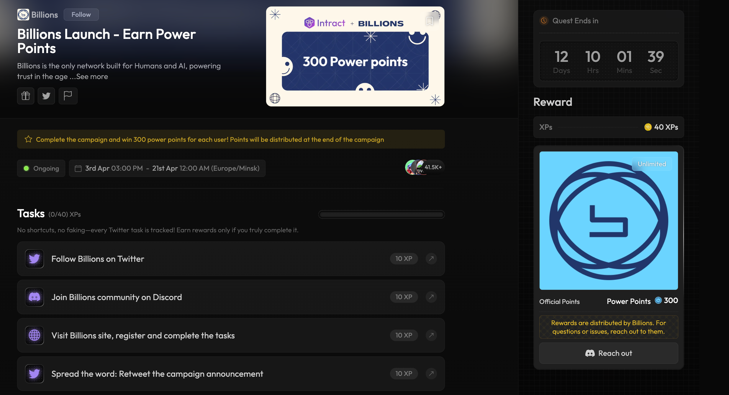 Billions has launched a campaign on Intract! We can complete simple tasks and earn 300 extra points.