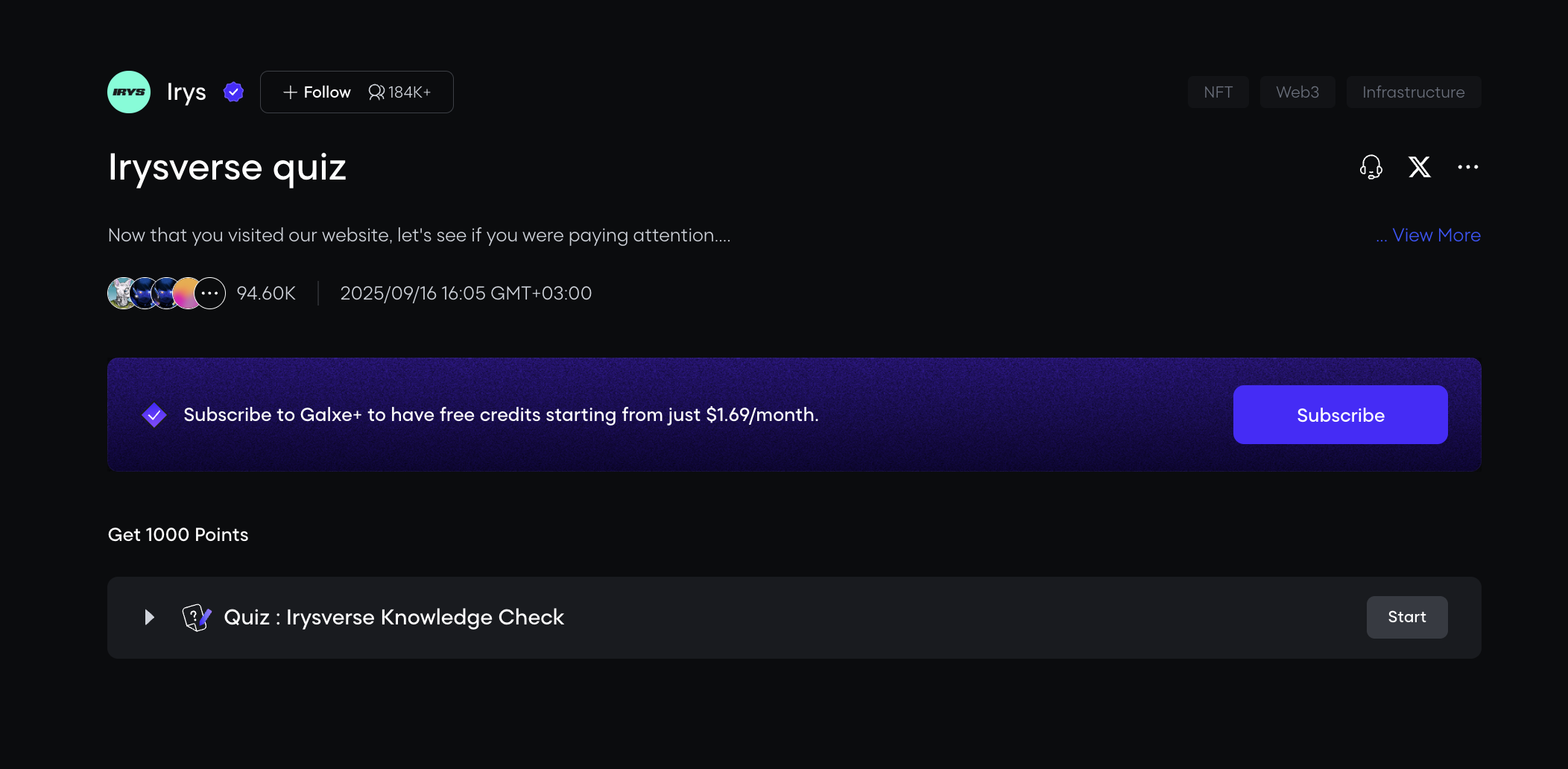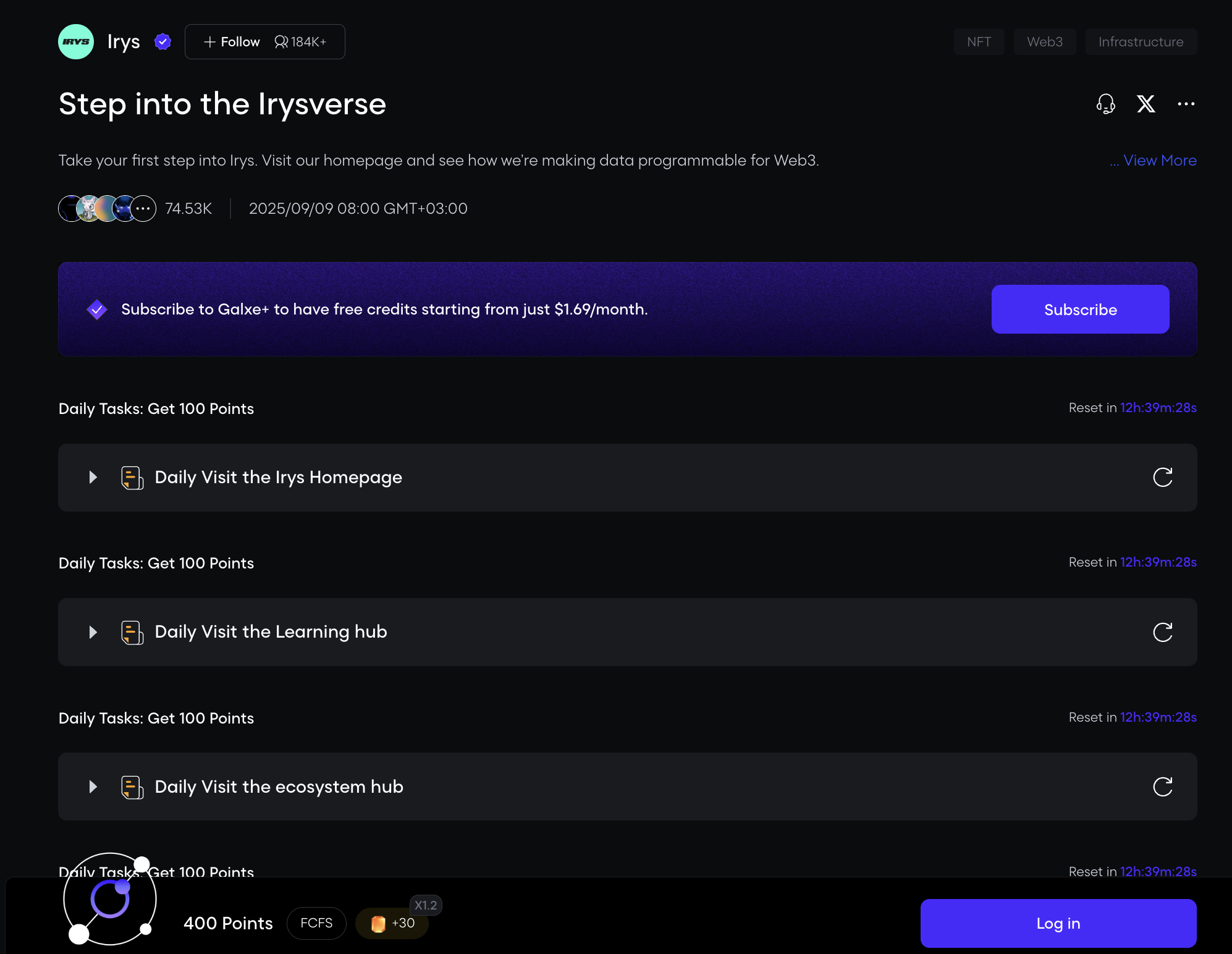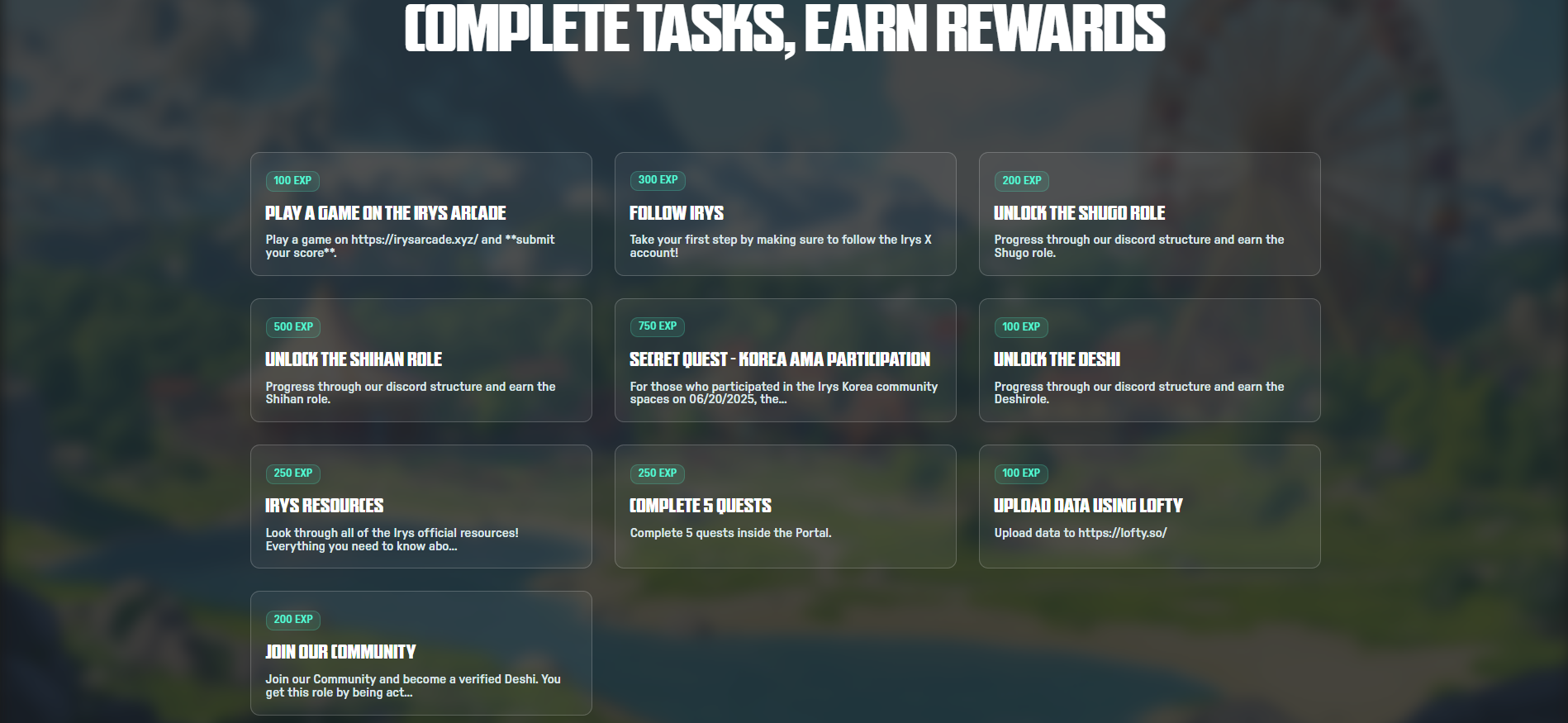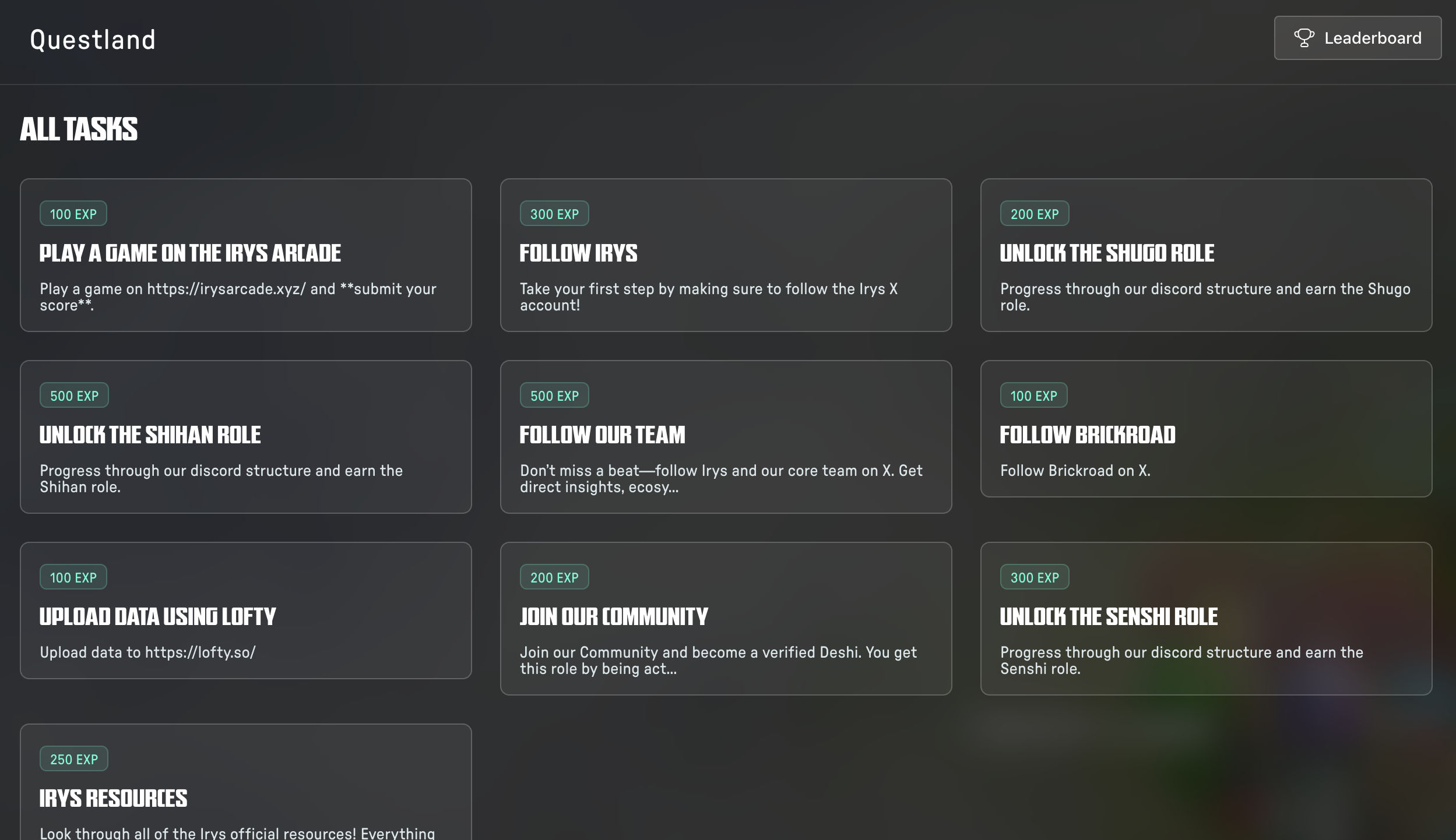 Irys has launched a new platform - Irys Portal. At the moment, only the quests section, Questland, is available there. We can complete them and earn XP. You will need to go to Galxe to complete the tasks.