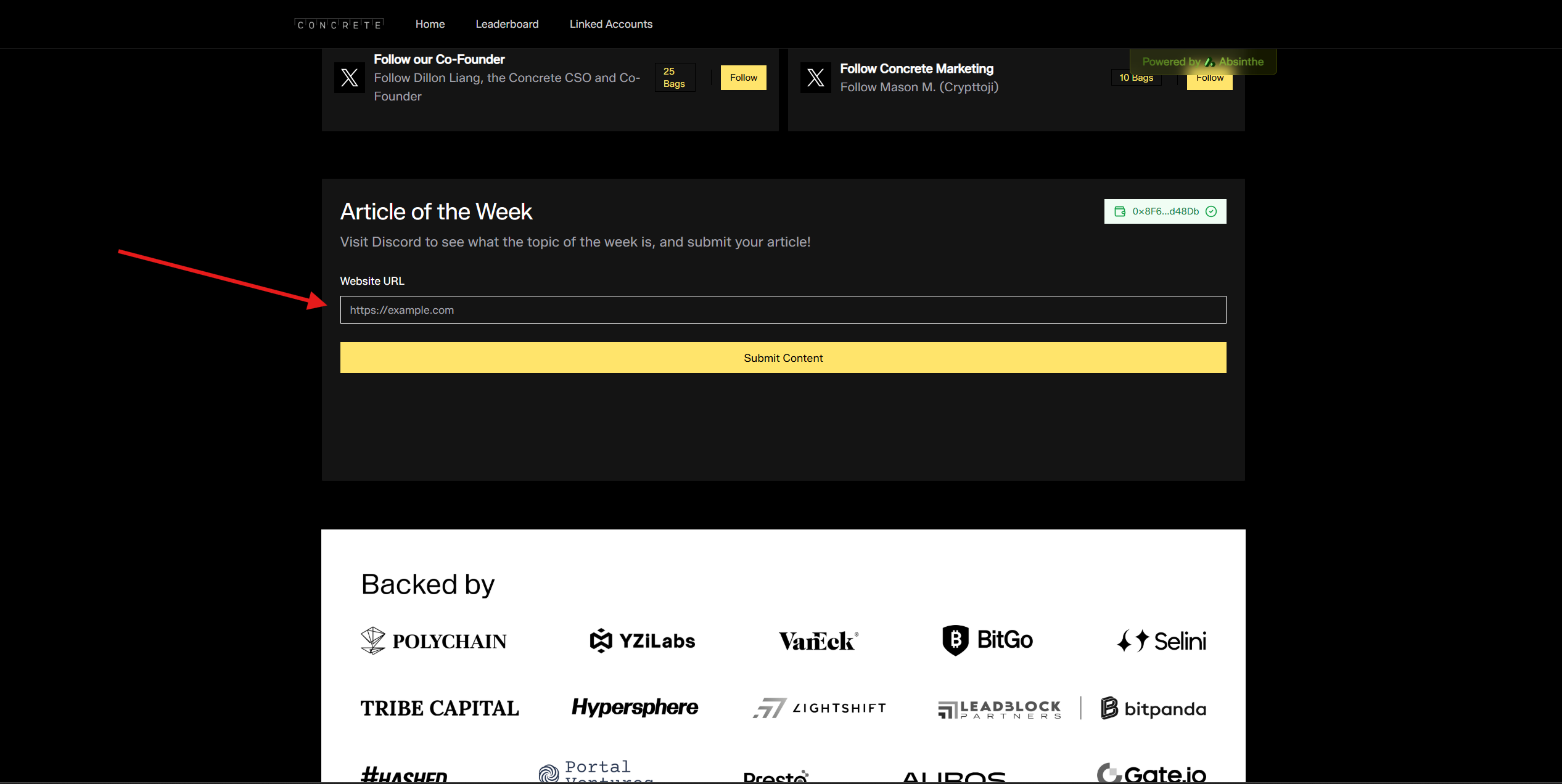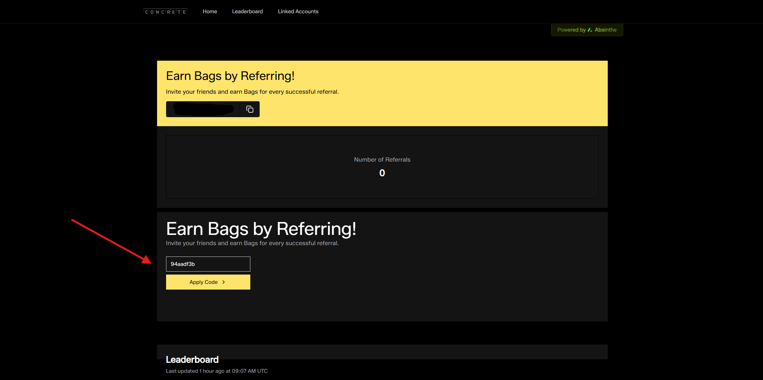 1. Go to the website and connect your wallet. Go to the Leaderboard and enter the code 94aadf3b.