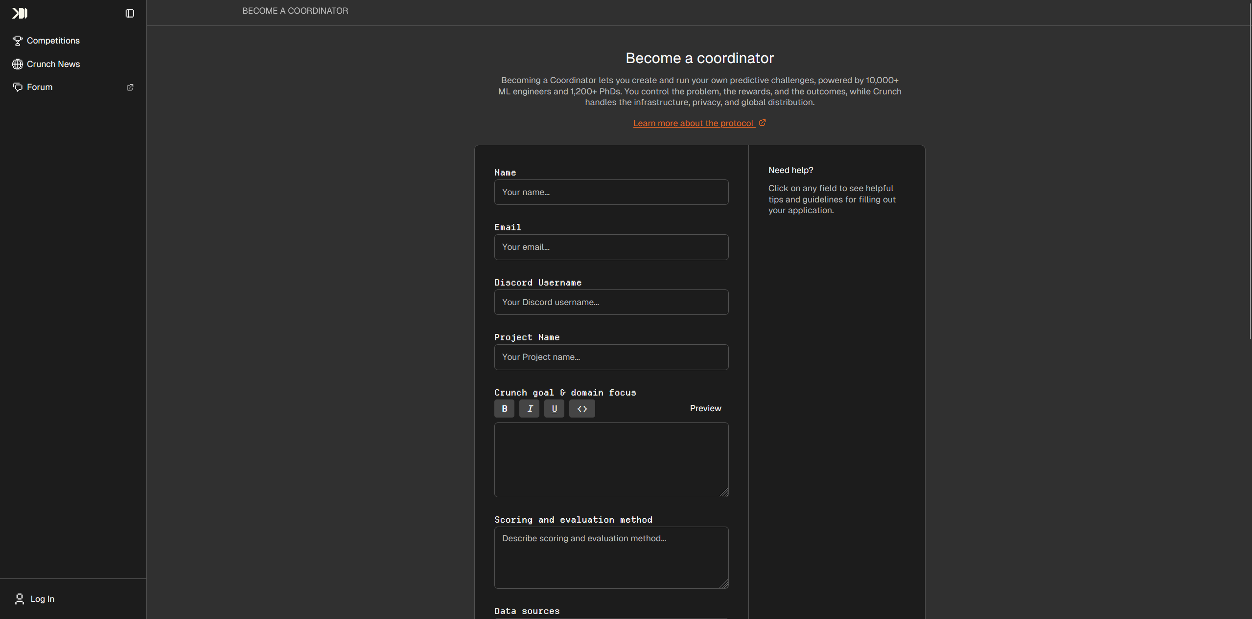 1. Go to the website and fill the form. A Coordinator is a network participant who creates machine learning tasks, evaluates their models, and organizes rewards.
