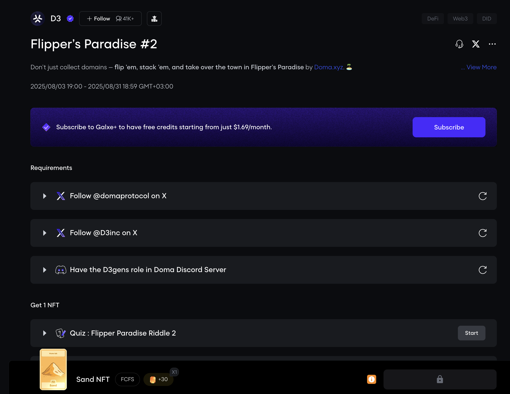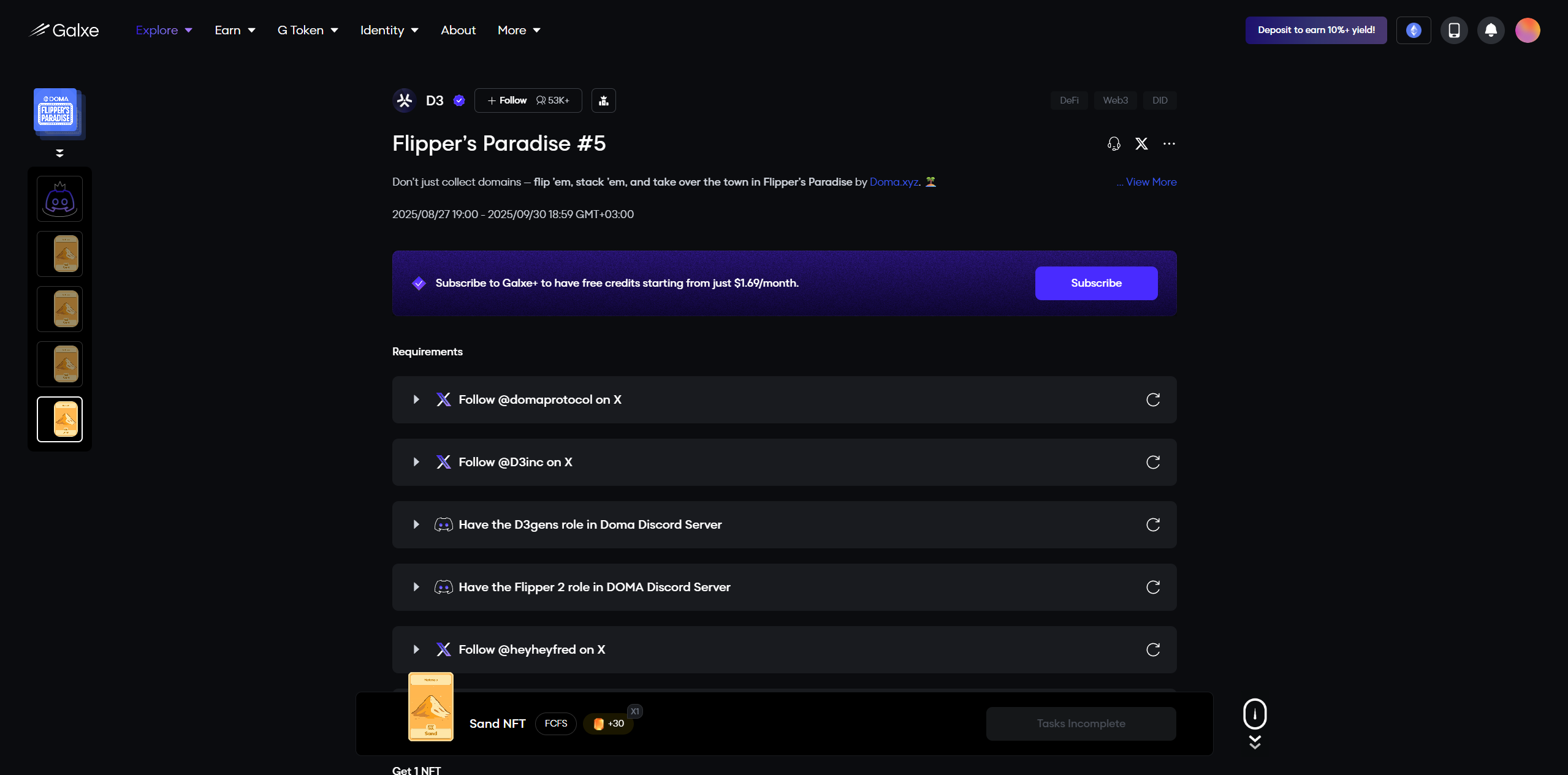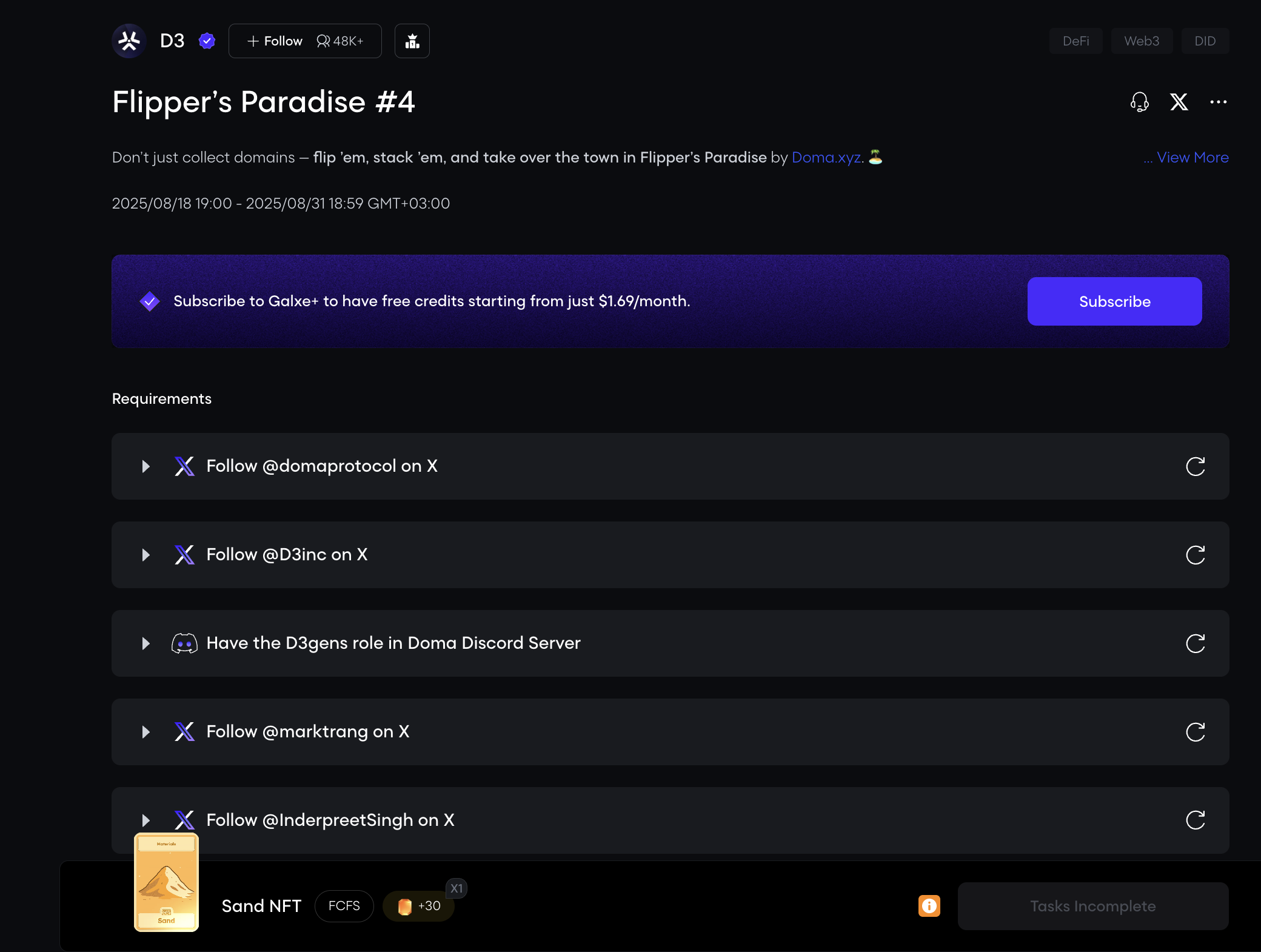 D3 launched tasks on Galxe. Complete them and earn points, which can be one of the criteria for getting airdrop.