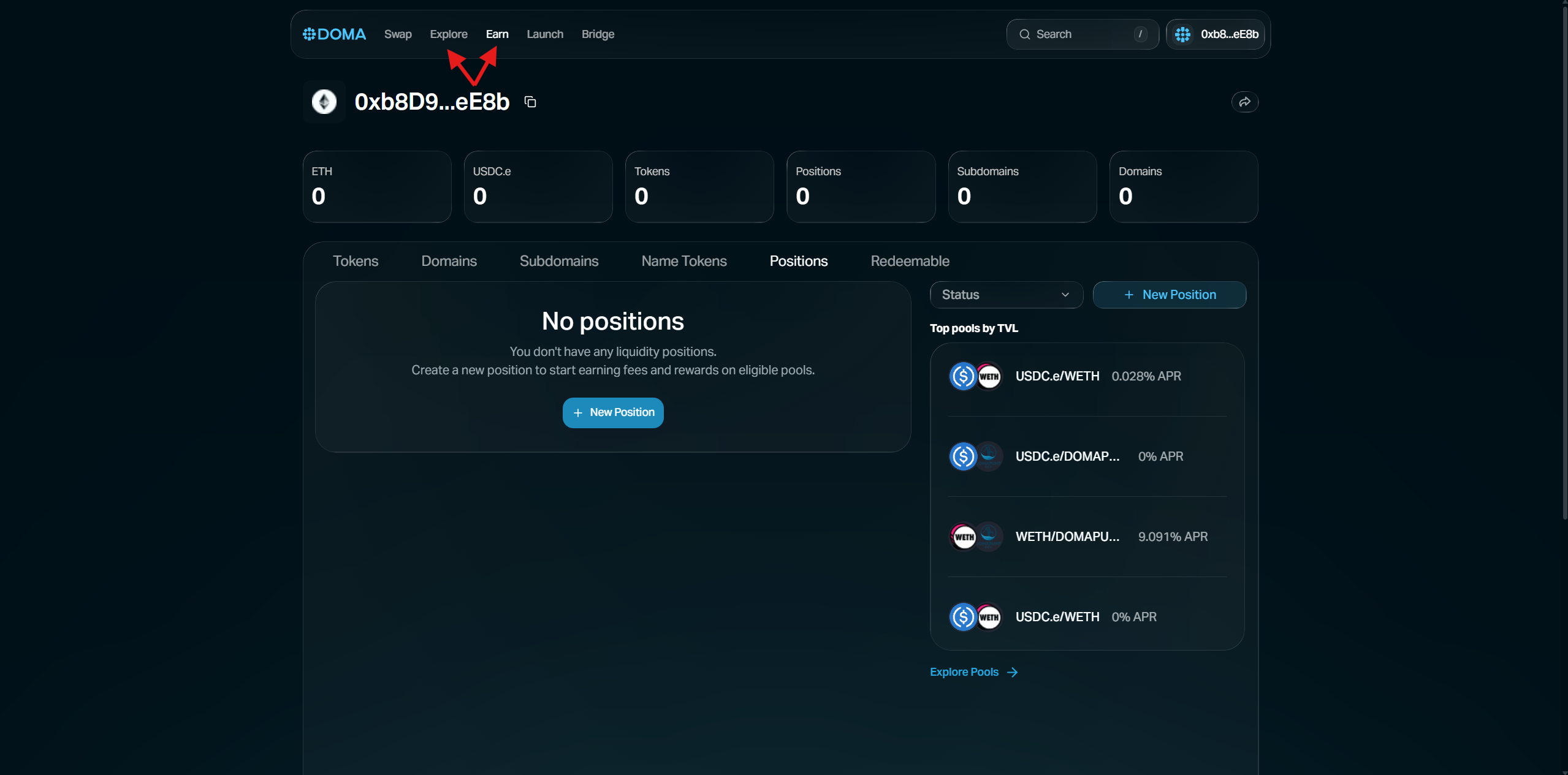 4. Explore and engage with available activities in the app in the Explore and Earn sections. You can buy any of the available domains or provide liquidity to pools.