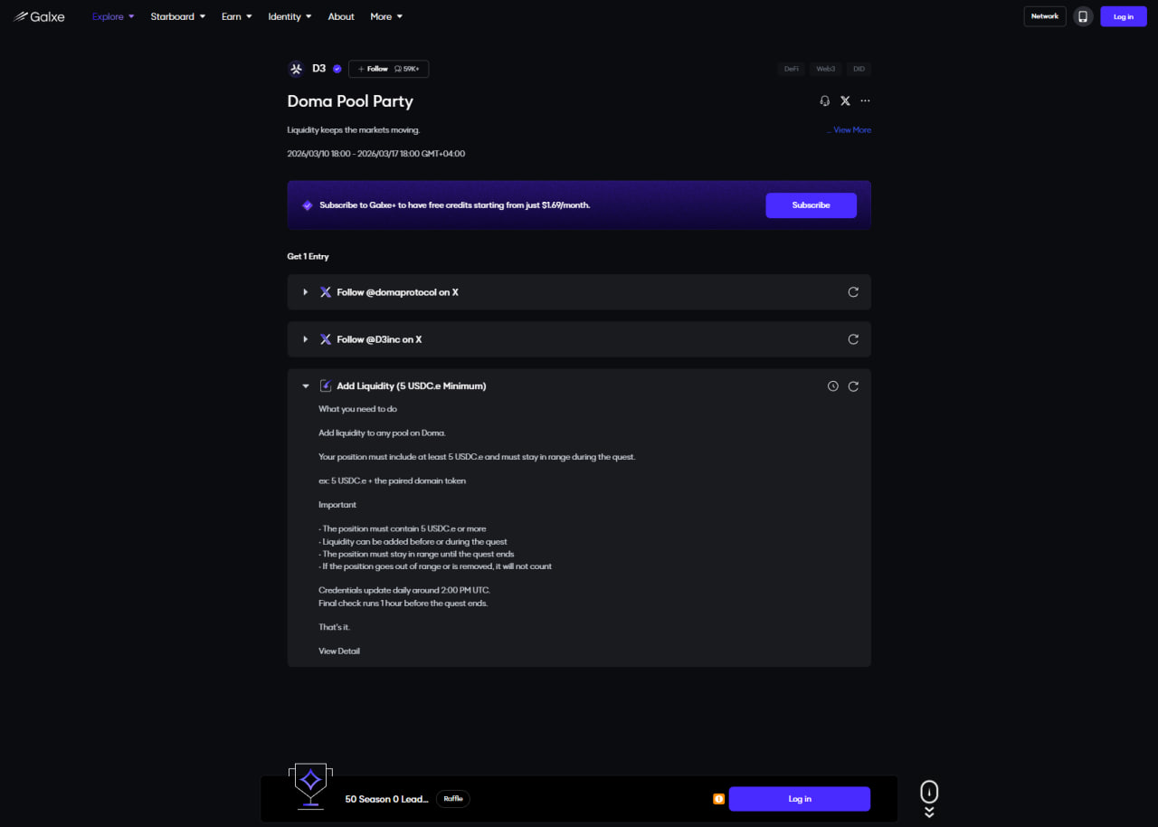 A new quest, Doma Pool Party, is available on the Galxe platform. You can deposit funds into any pool on Doma and receive 50 points for Season 0