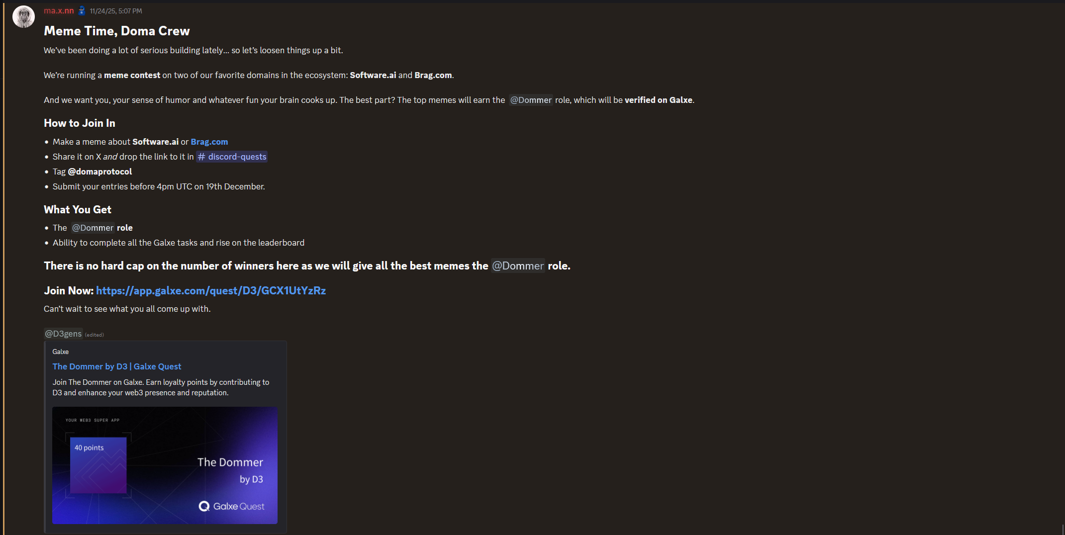 3. To get the Dommer role you need to participate in Meme contest in Discord. Create a meme about domains software ai or brag com. Create a tweet with your meme and tag a @domaprotocol. Share link to your tweet in discord-quests channel.