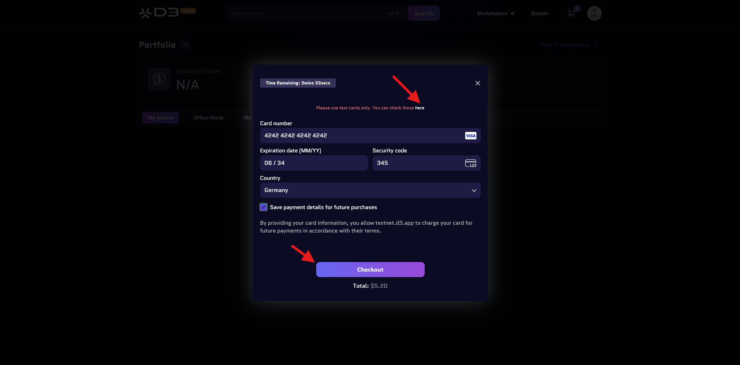 2. Chọn một tên miền .ai miễn phí và thanh toán bằng thẻ test. Bạn có thể tìm thấy thẻ test bằng cách nhấp vào liên kết trong hộp thoại.