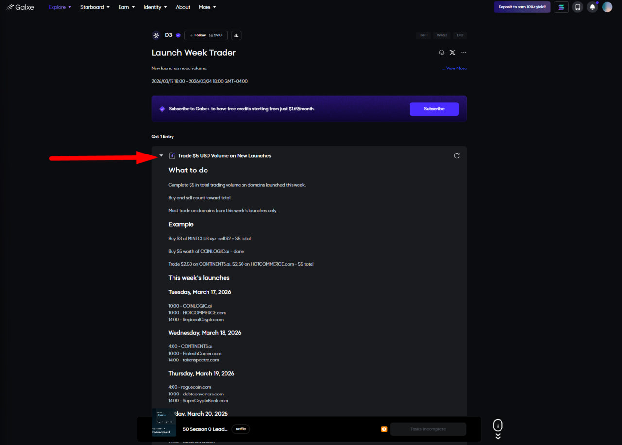 A new quest is available on the Galxe platform. You can complete social tasks and purchase 100 tokens from the newly launched domain to receive 50 points.