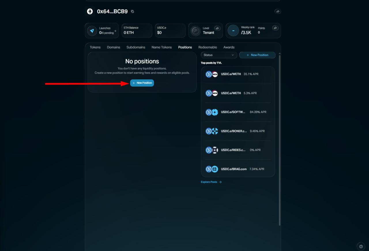 2. In the Positions tab, deposit tokens into the pool in an amount equal to $25