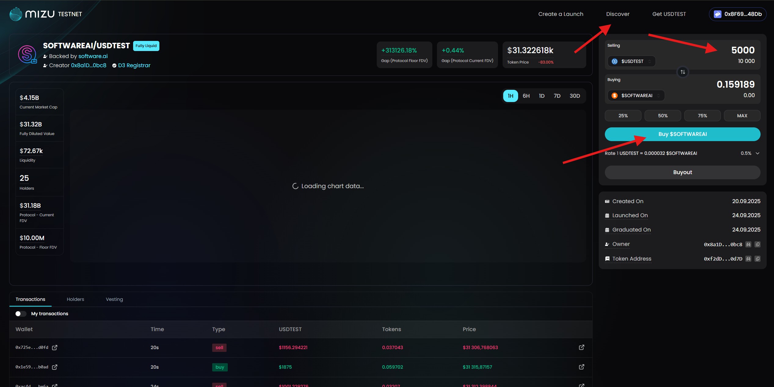 5. Trade test tokens in Discover section.