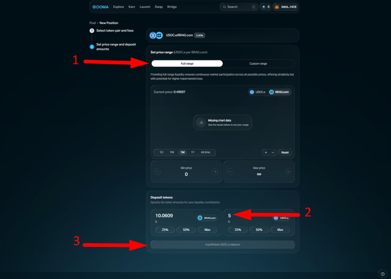 5. Select Full Range and contribute at least 5 USDC to the pool to fulfill the Galxe quest requirements