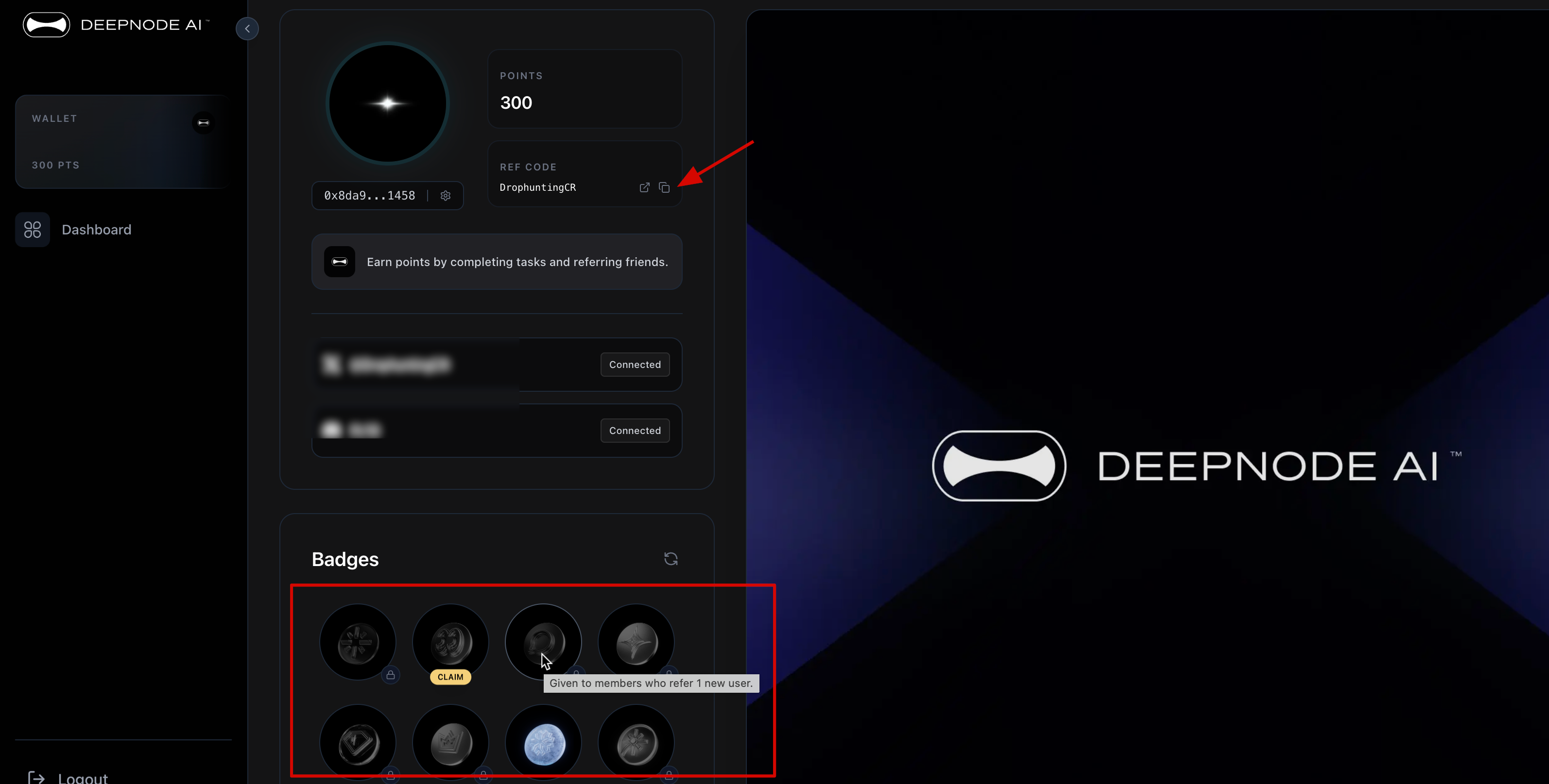 DeepNodeAI has announced its first activity. We can collect badges for completing tasks and inviting friends. Perhaps the best users on the leaderboard will get early access to future activities.