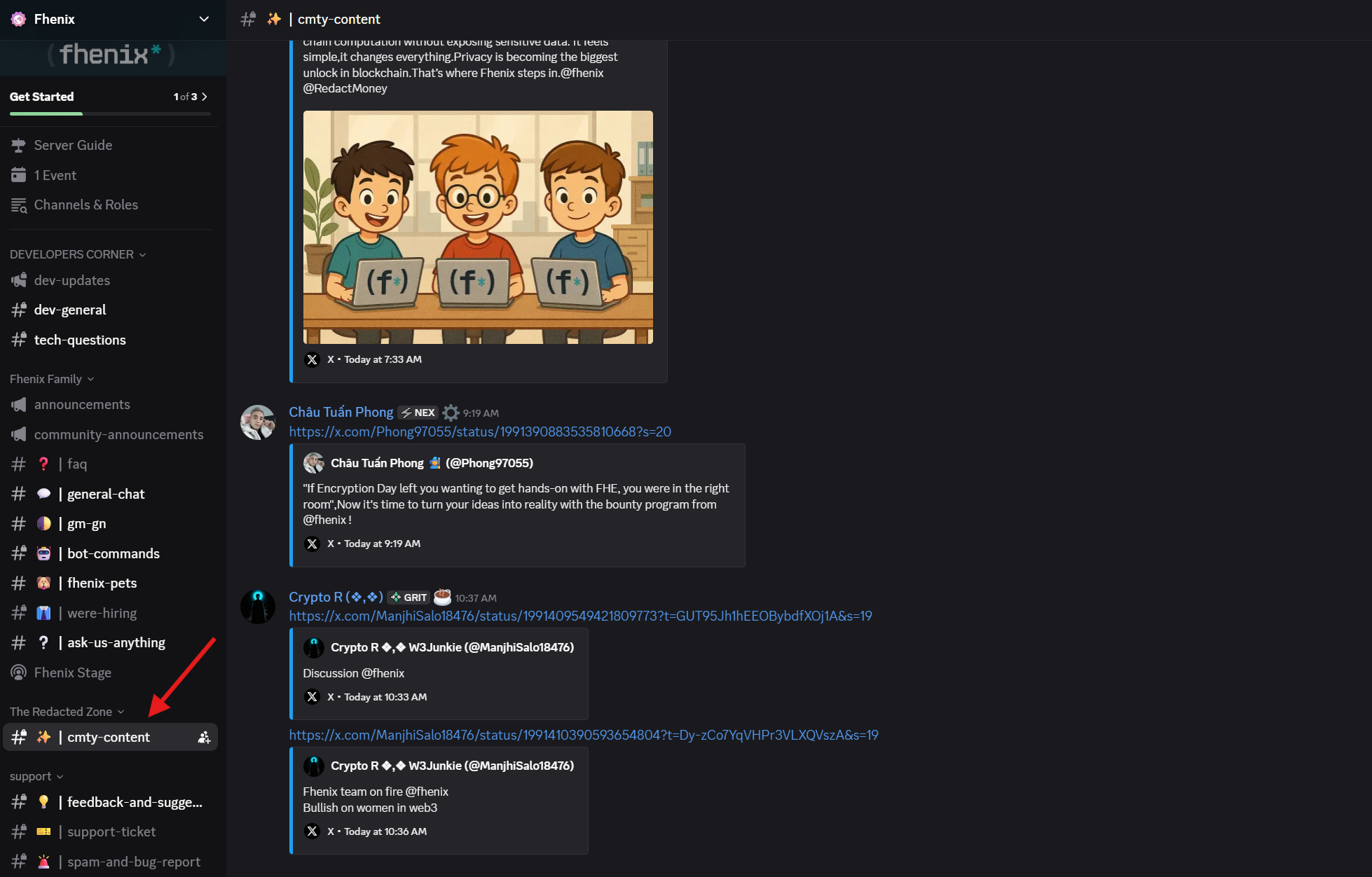 2. You must earn the Starter or Enthusiast role through active participation on the server. This is a mandatory for obtaining the Redact Masters role. Be active in discussions in the chats and participate in events. Create relevant tweets with the tags @fhenix @RedactMoney and submit them in the cmty-content channel. Note that all roles are assigned manually by moderators or the team. To learn more about the conditions, check the pinned messages in the general and cmty-content channels.