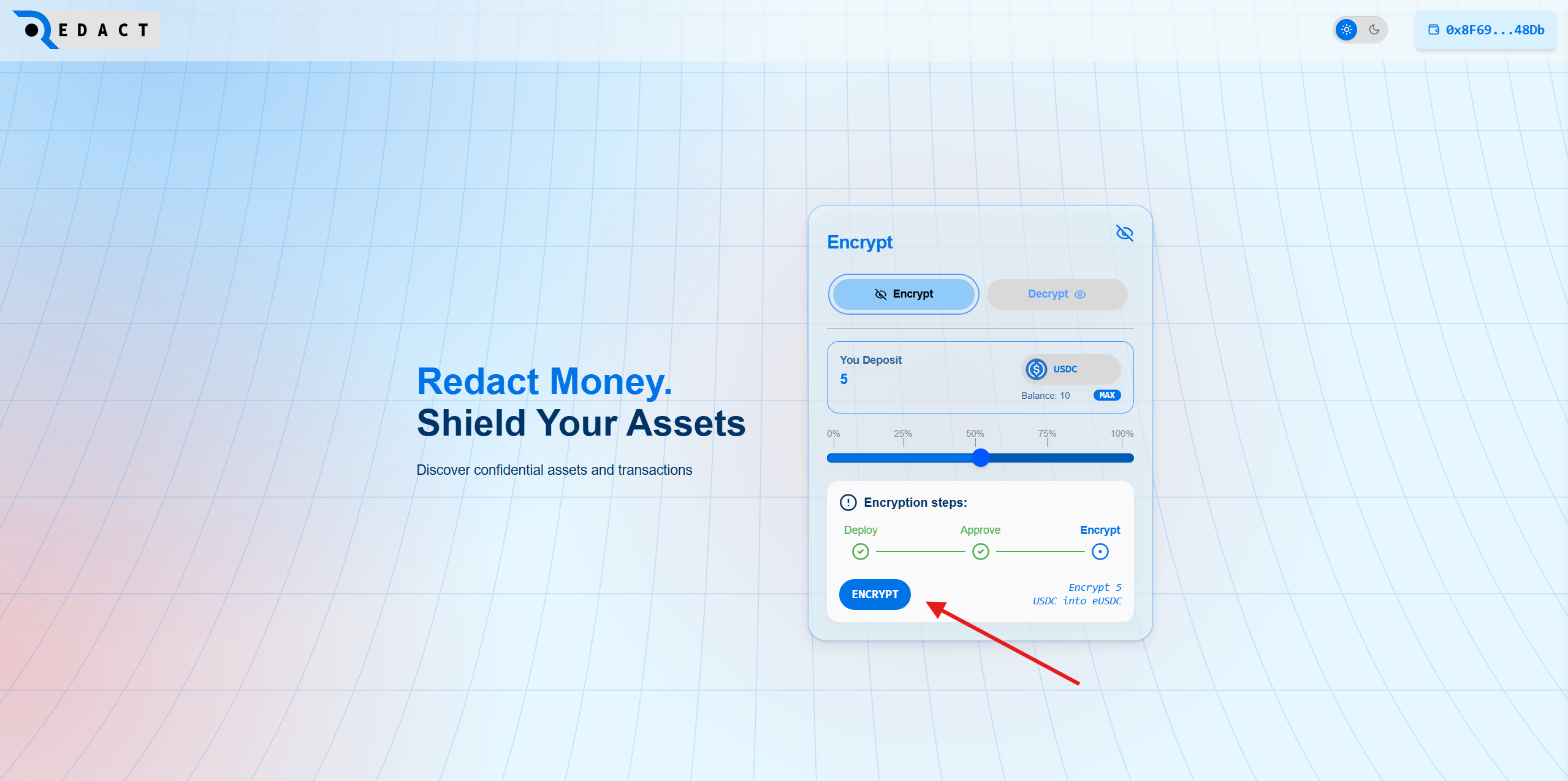 3. Sign the Approve and click Encrypt to receive test eUSDC.