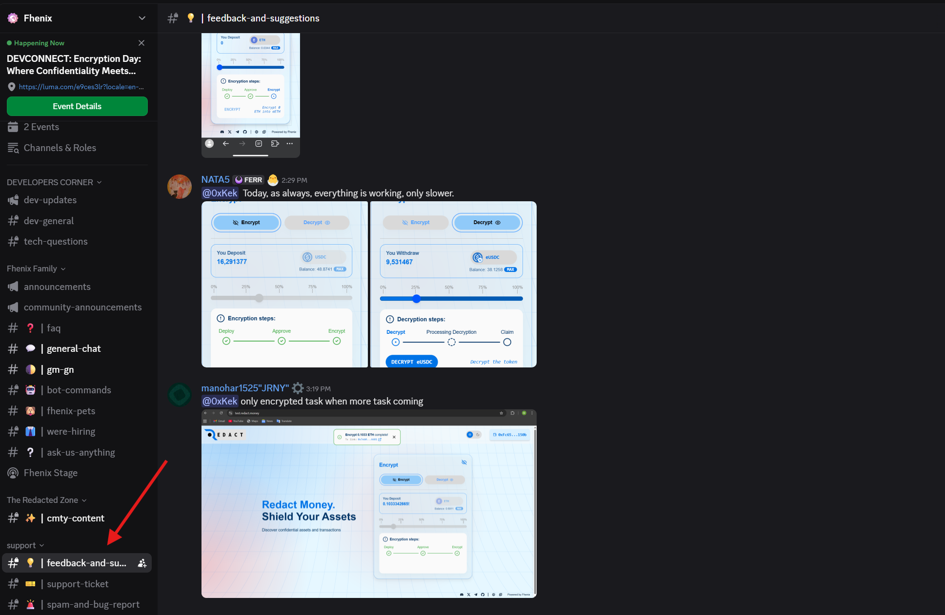 4. Go to Discord via the official website and send feedback about Redact in the feedback-and-suggestions channel. Ping moderator cryptoav in your message to get a role.