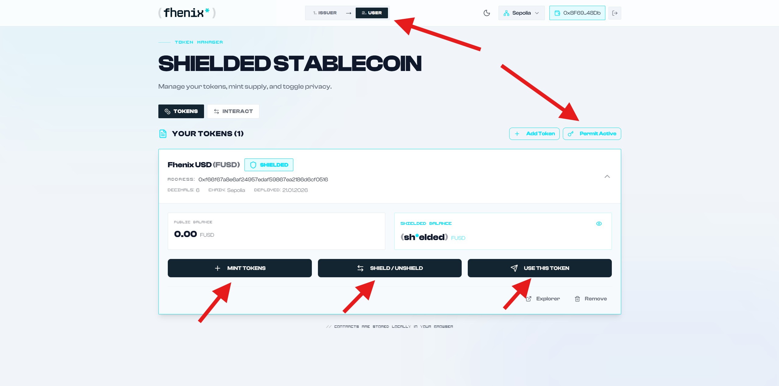 3. Go to the User section After deploying the contract. Click Permit Active and sign the message in your wallet. Interact with your token by minting tokens, sending them, and using the Shield feature.