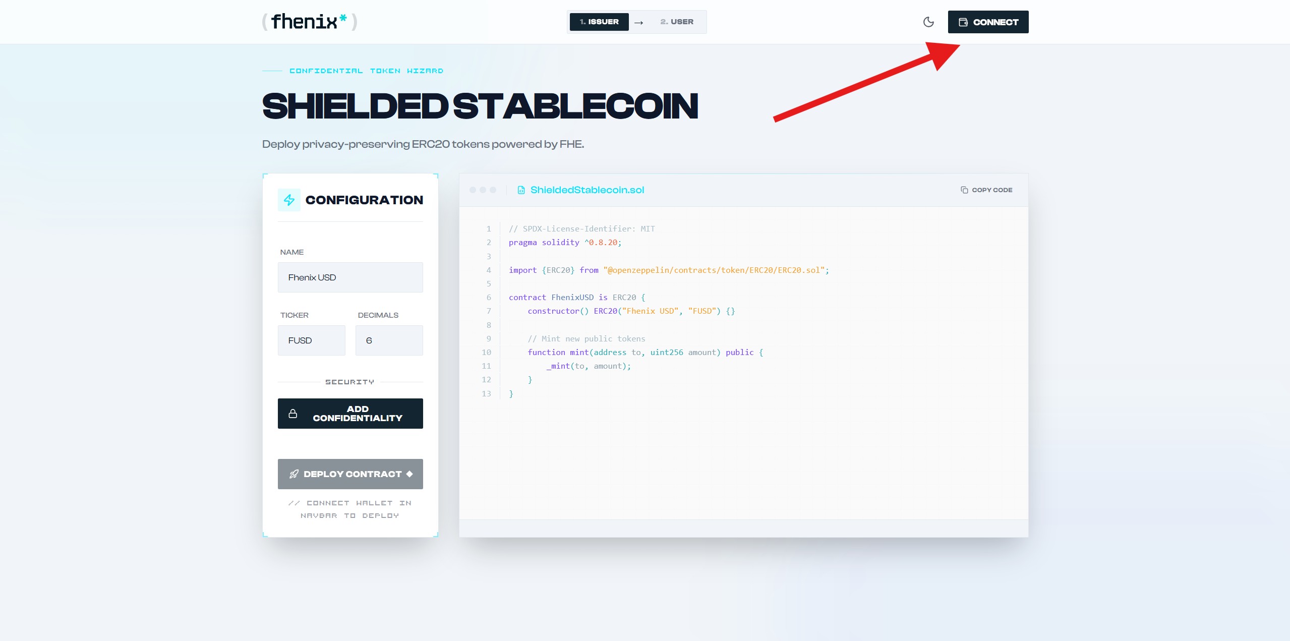 2. Click Add Confidentiality and then Deploy Contract. Please note that you will need ETH on the selected testnet. Available networks include ETH Sepolia, Arbitrum Sepolia and Base Sepolia.