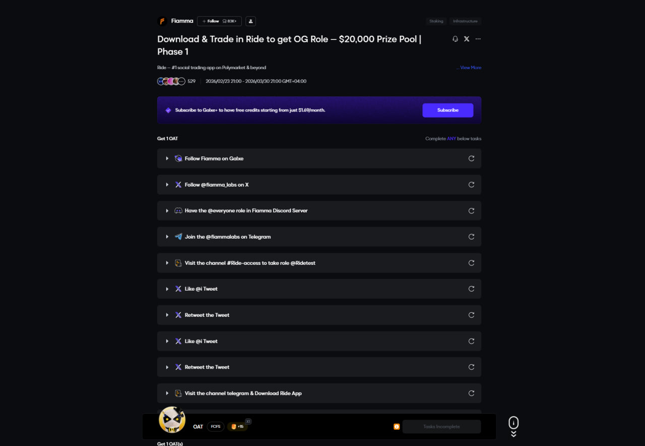 The Ride - Early Access Whitelist campaign is available on the Galxe platform. You can complete it by performing simple social tasks and receive the "Ride Early Access" OAT.