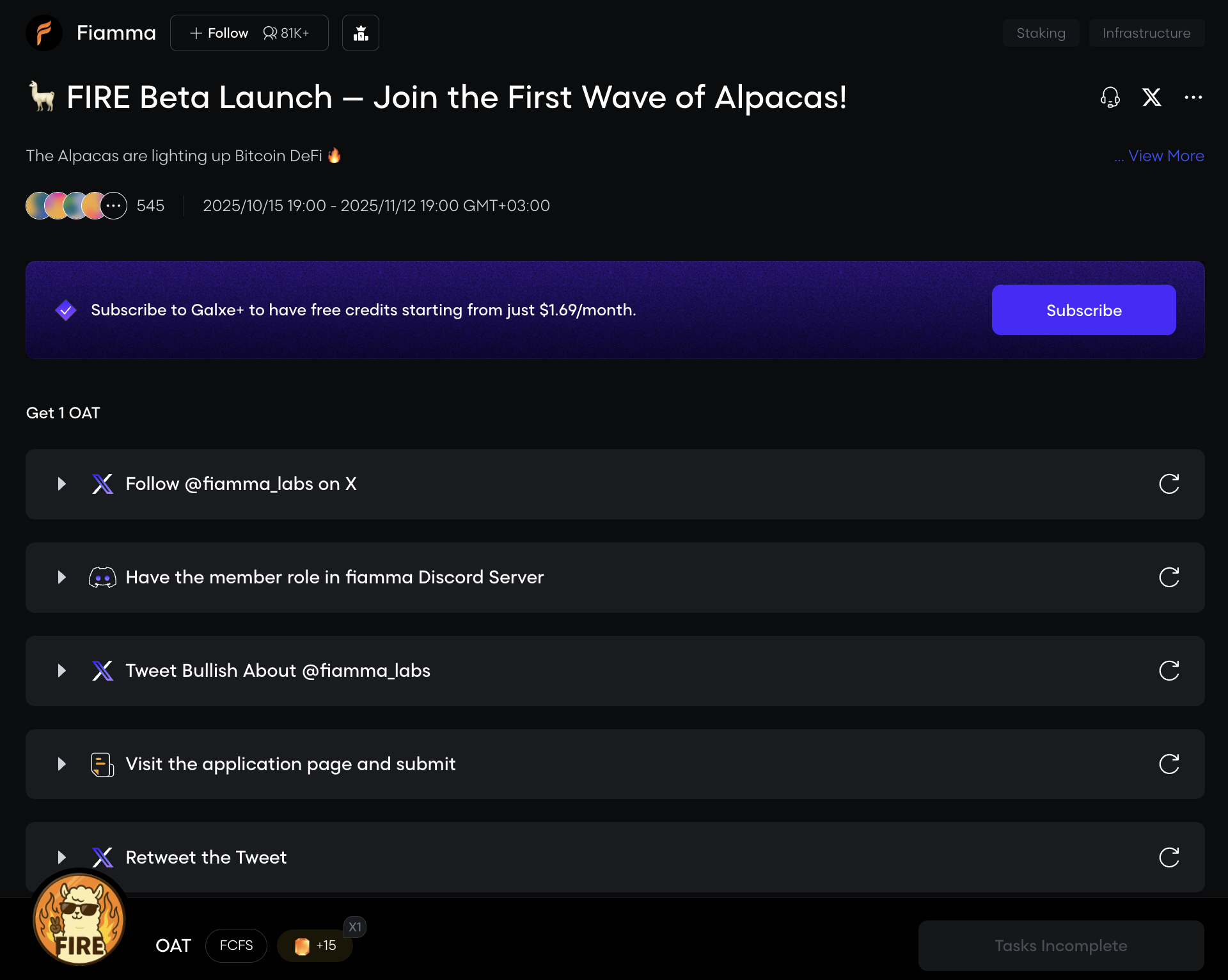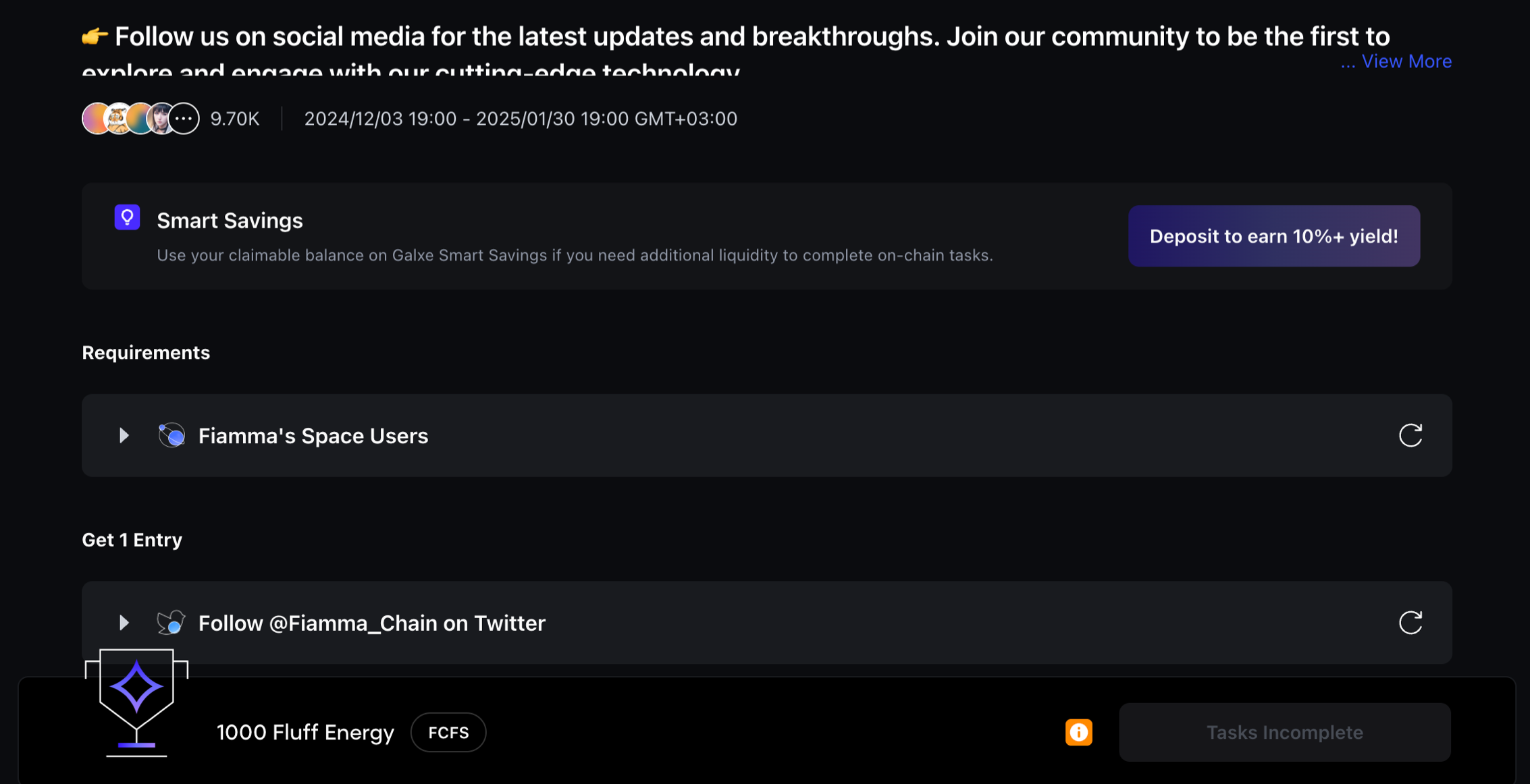 Also Project Fiamma has launched a campaign on Galxe! We can complete tasks and get 1000 Fluff Energy, which we will need in the testnet.