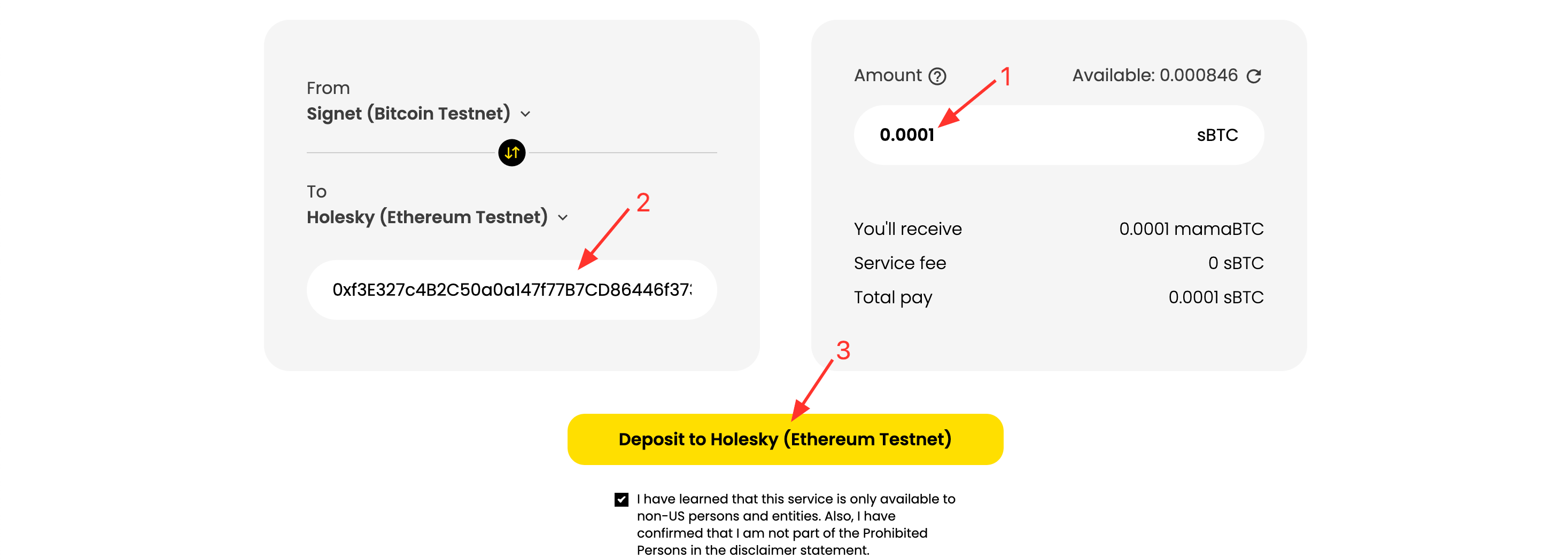 6. Open the Bridge tab and send test BTC tokens to your EVM wallet on the Holesky network (this may take up to 30 minutes):