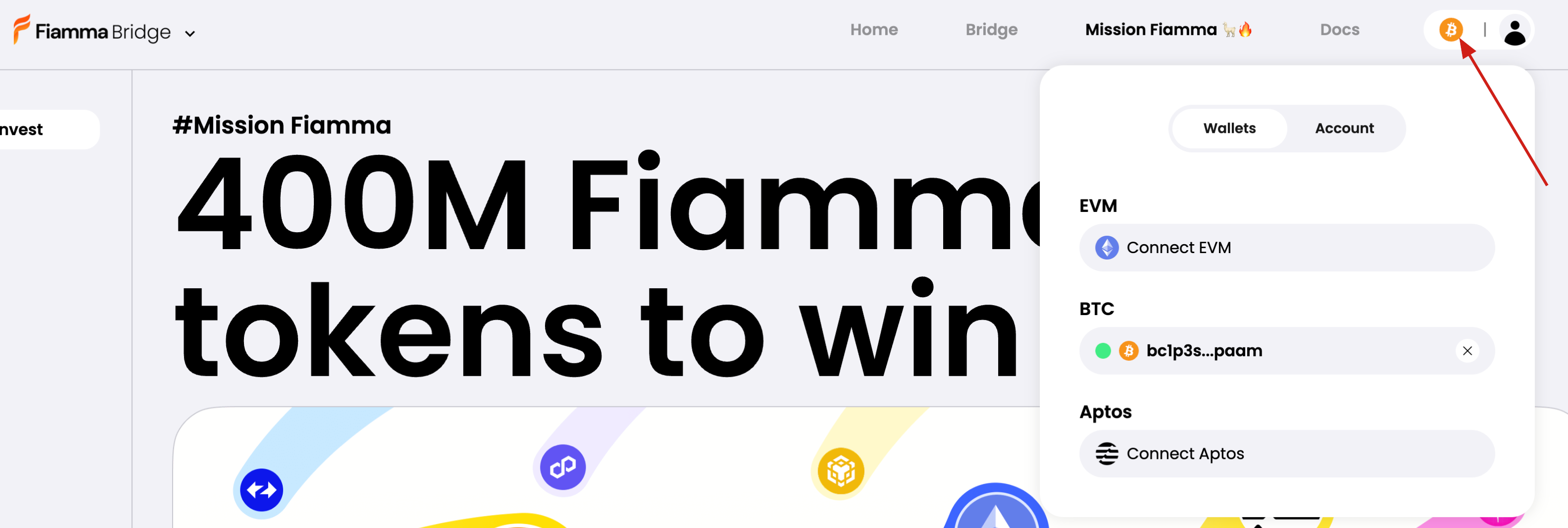 1. Vào website và kết nối các ví EVM, Aptos, và Bitcoin của bạn: