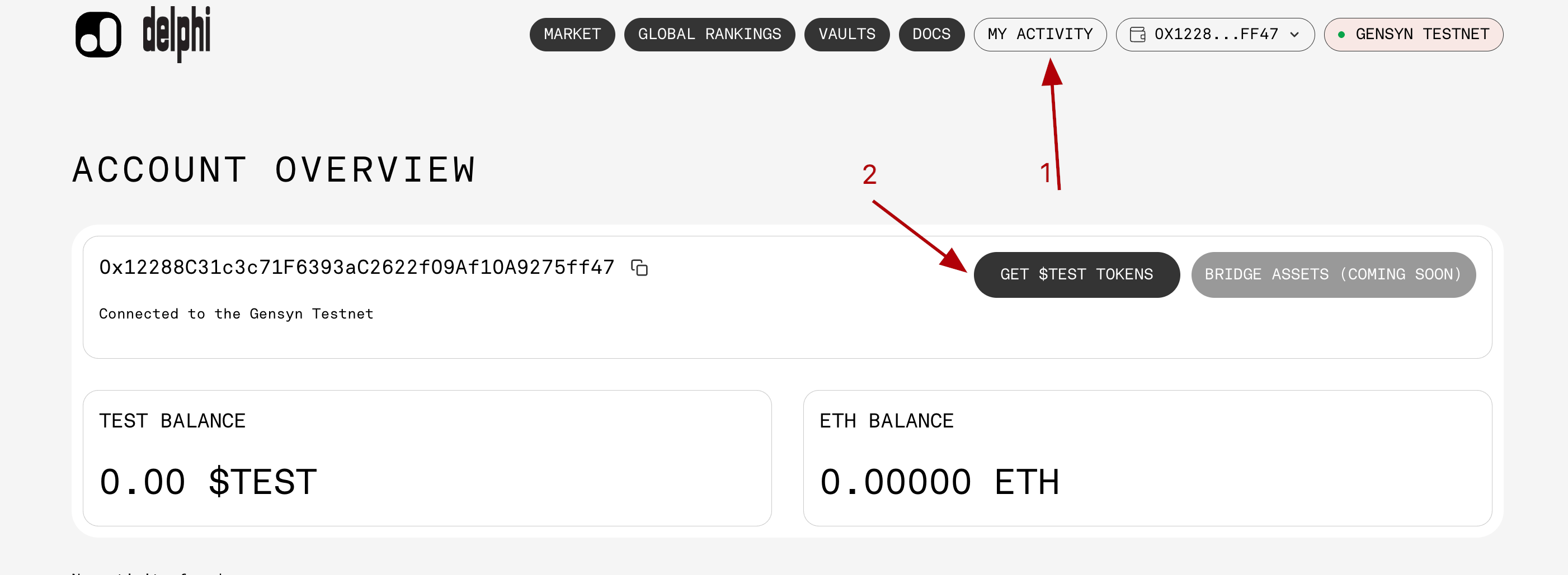 1. Go to the website, connect your wallet, and request test tokens in the My activity tab: