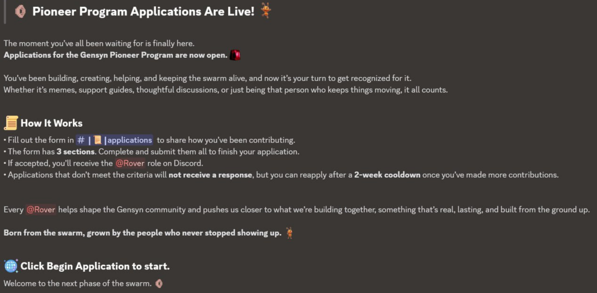 Gensys has opened applications for users participating in the Gensyn Pioneer Program. If your application is approved, you will receive the @Rover role. If you do not receive a response, your application has been rejected and you can submit a new one in two weeks.