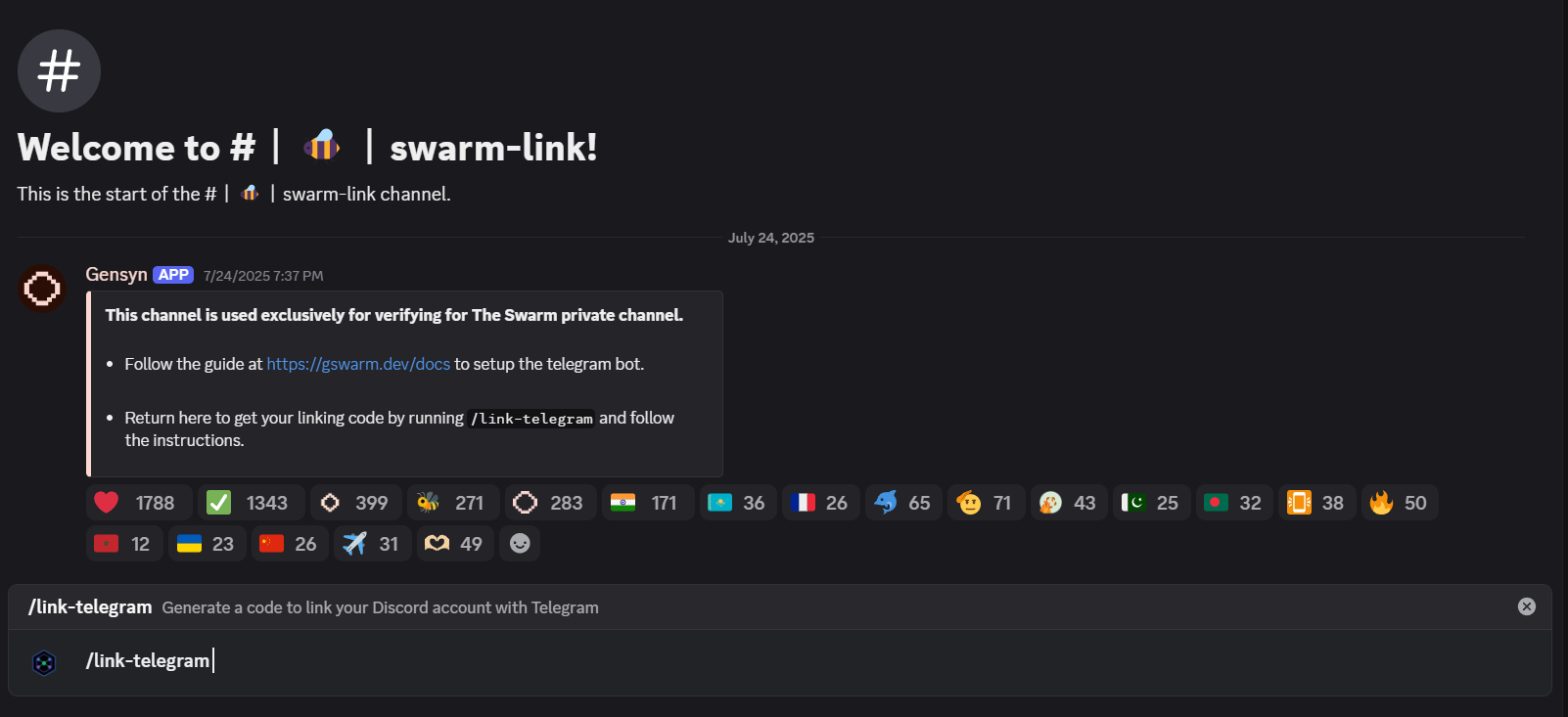 4. In the Swarm-link channel, enter the specified command. Verify your Telegram bot. After that, you will receive the Swarm role.