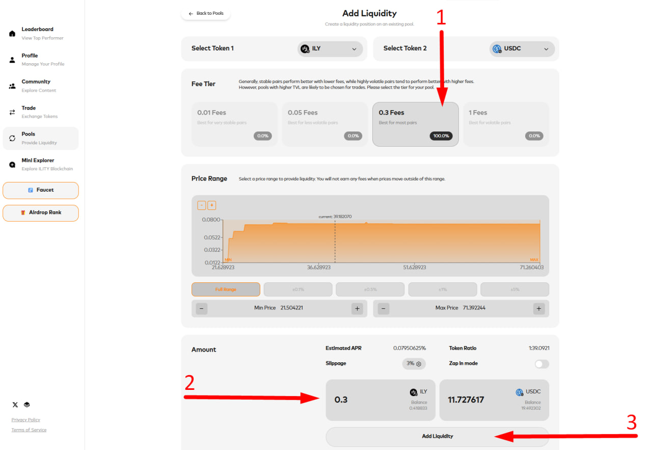 8. To make the pool available, click on the "0.3 Fees" fee tier. Enter the amount of assets and add liquidity