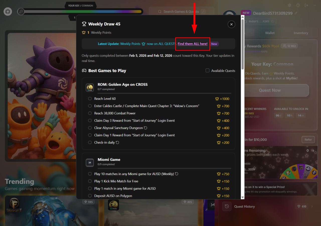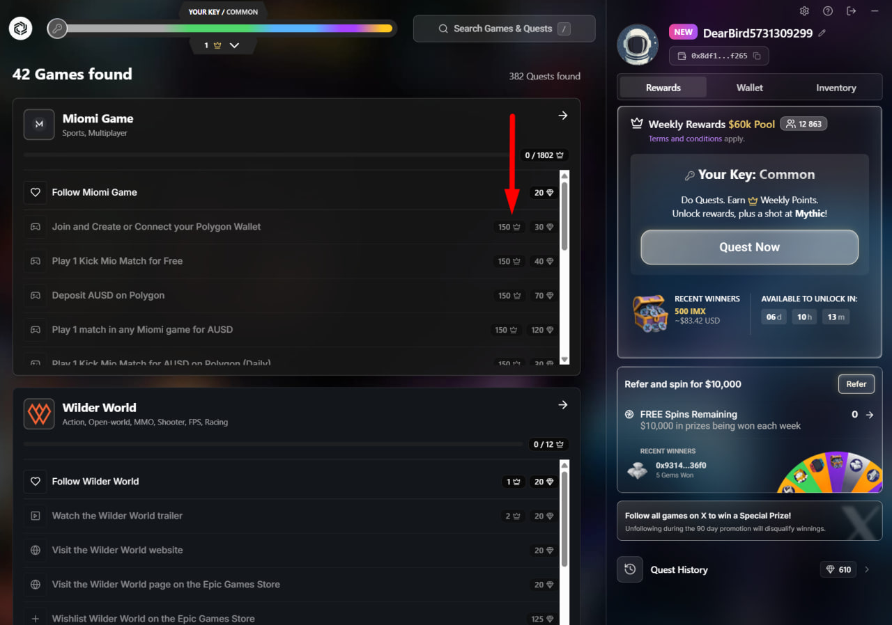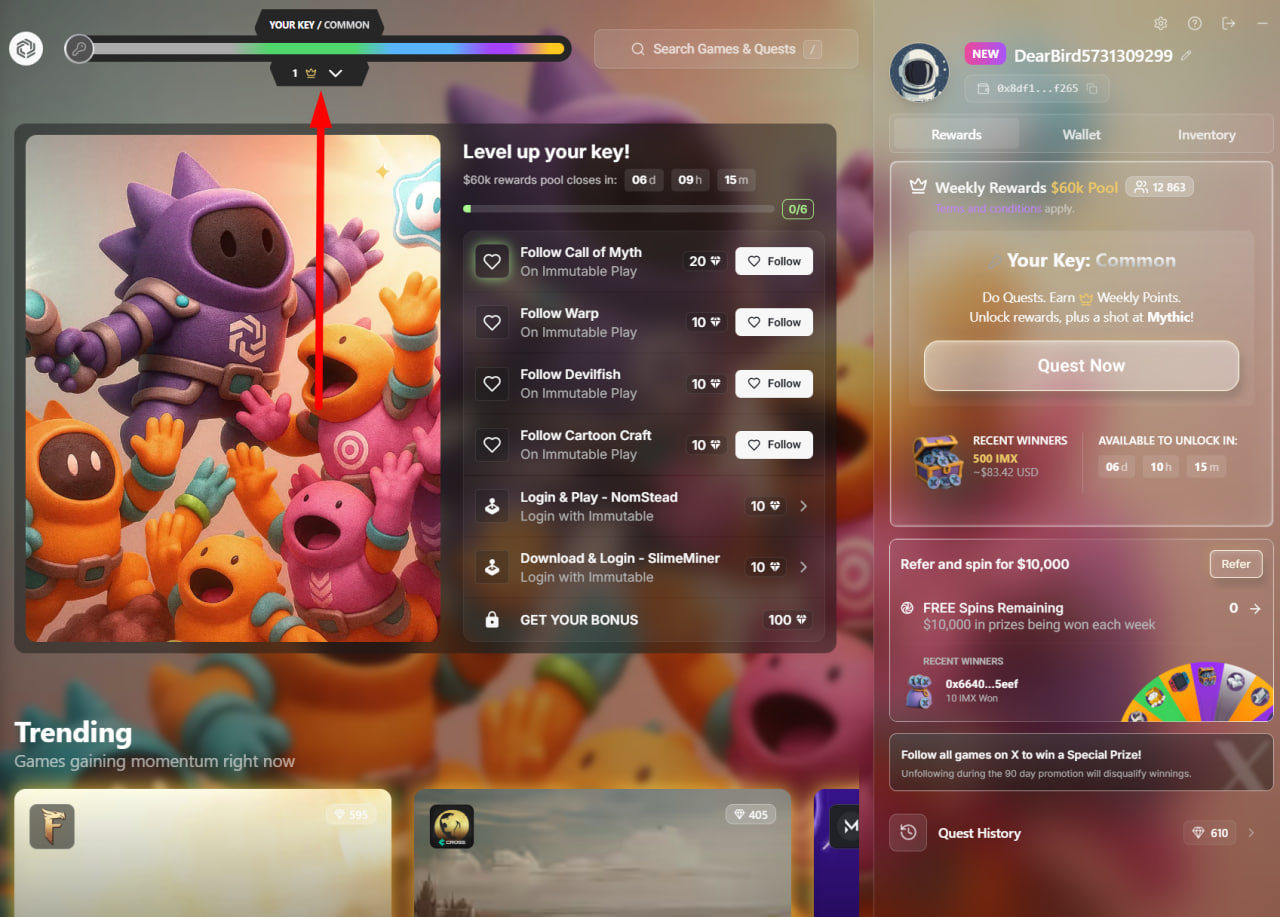 The Immutable gaming portal offers the opportunity to earn gems for completing quests related to gaming activity.
