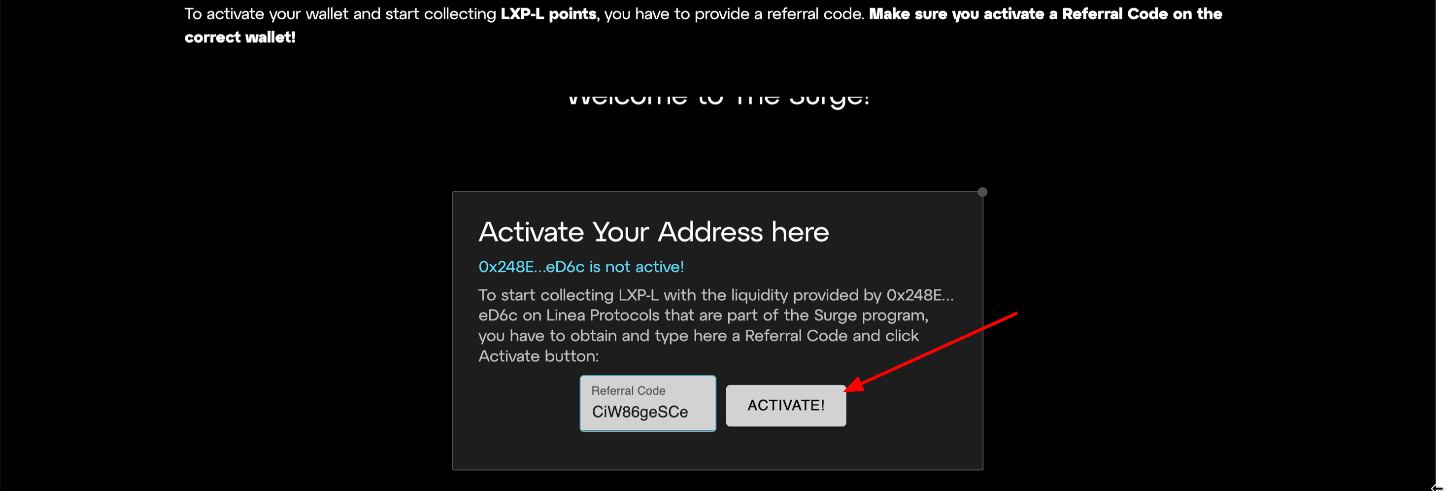 Linea Surge is a points-driven program that provides you with LXP-L tokens for having assets #OnLinea and deploying it into DeFi protocols on the network. You definitely need to activate your wallet to participate in Linea Surge (guide in the previous step).