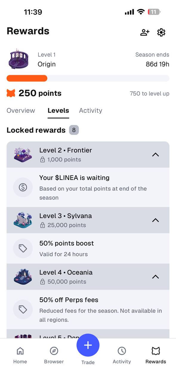 There are 7 levels available in total, and you will receive various rewards (discounts, LINEA tokens, boosts) for reaching each level. You earn x2 points for activity on the LINEA network. Update the app if you don't see the Rewards tab.