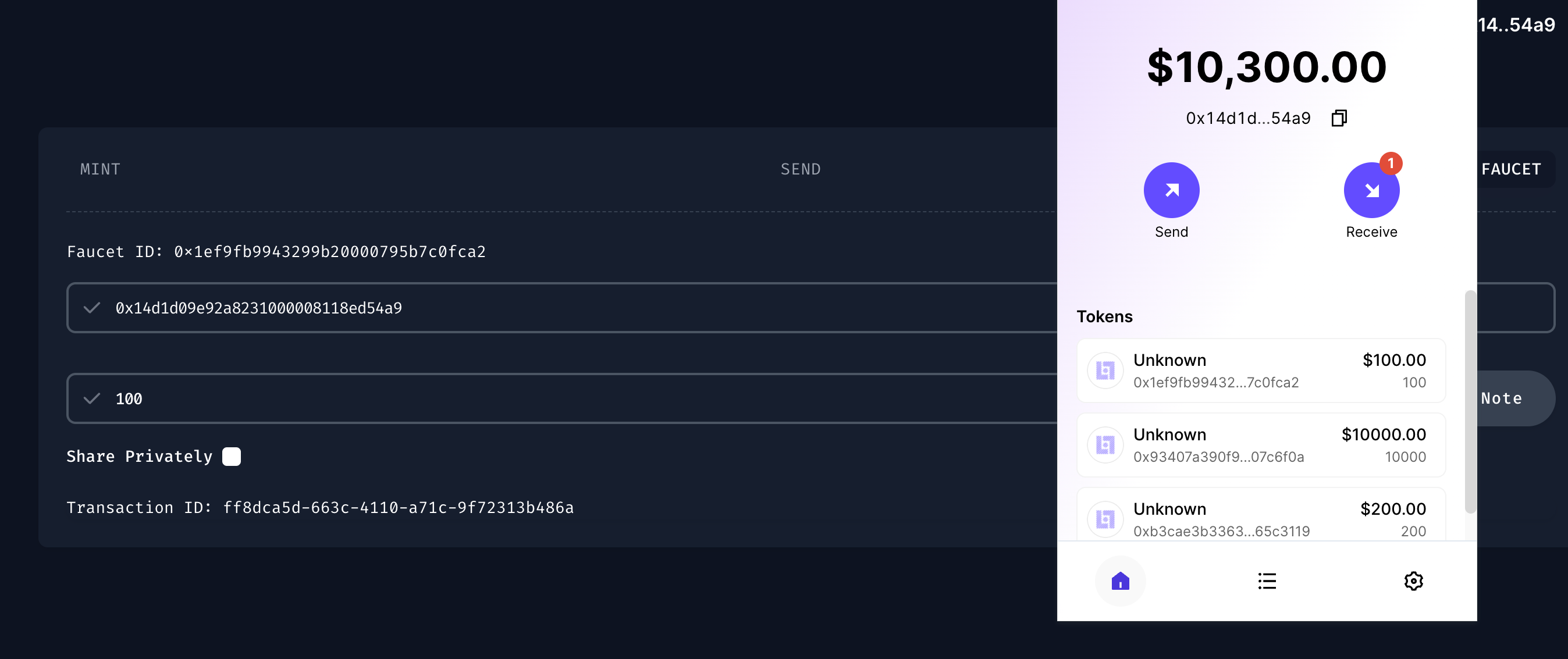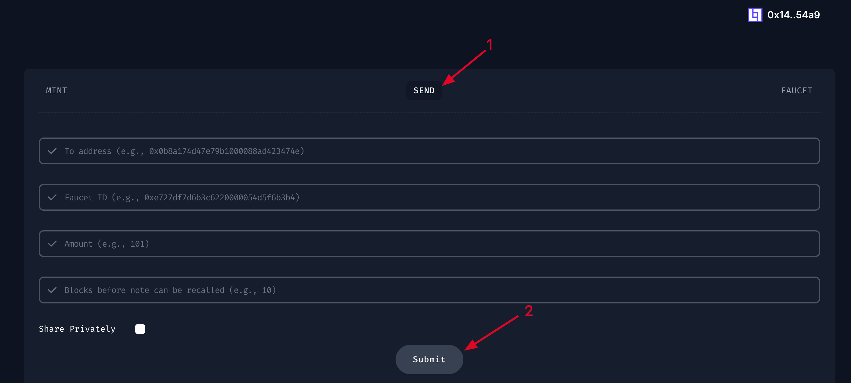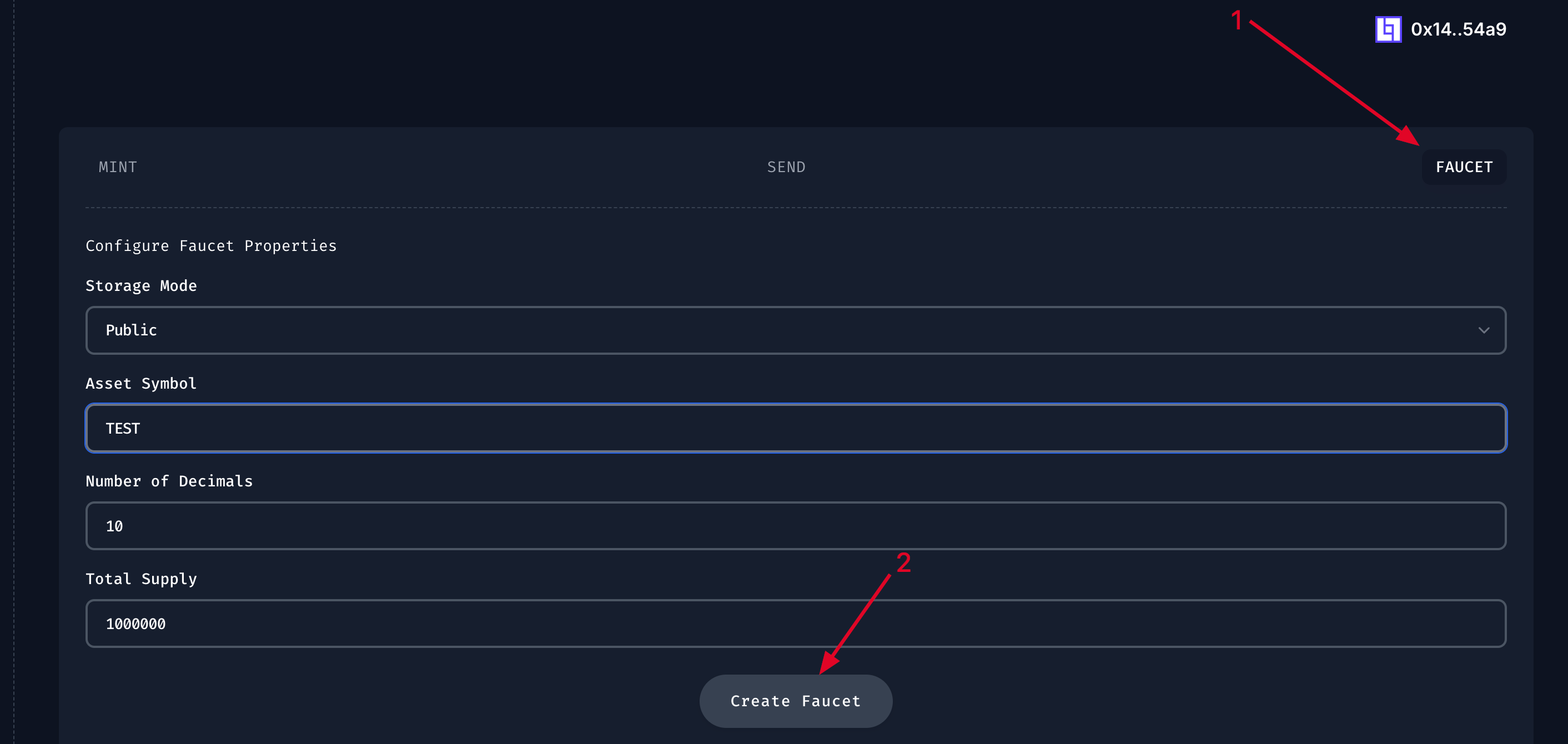 5. Gửi token test đến bất kỳ ví nào (bạn có thể sử dụng ví của mình hoặc ví này: 0x14d1d09e92a82a823131000008118ed54a9). Trong trường Faucet ID, nhập ID của faucet bạn đã tạo trước đó: