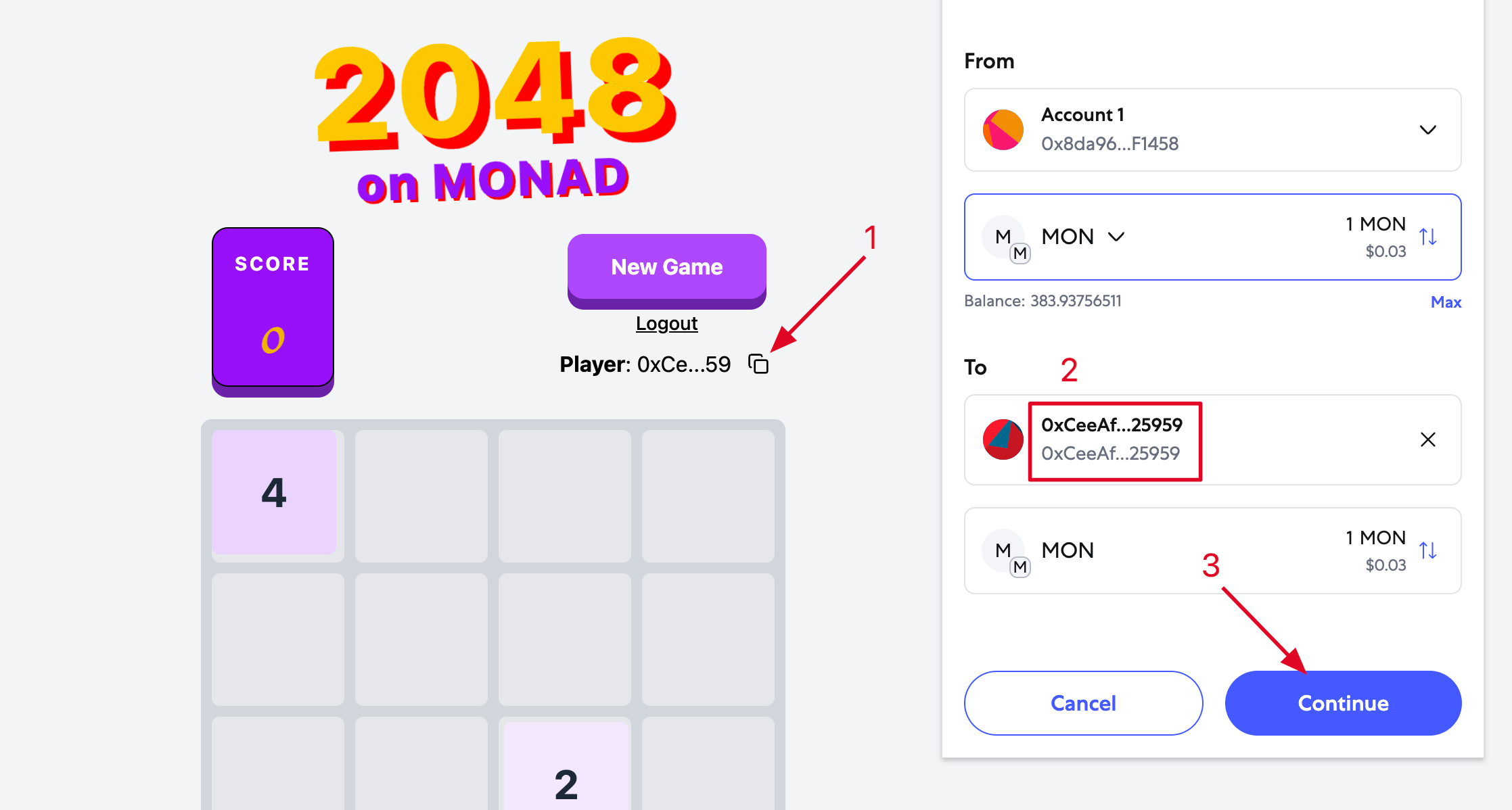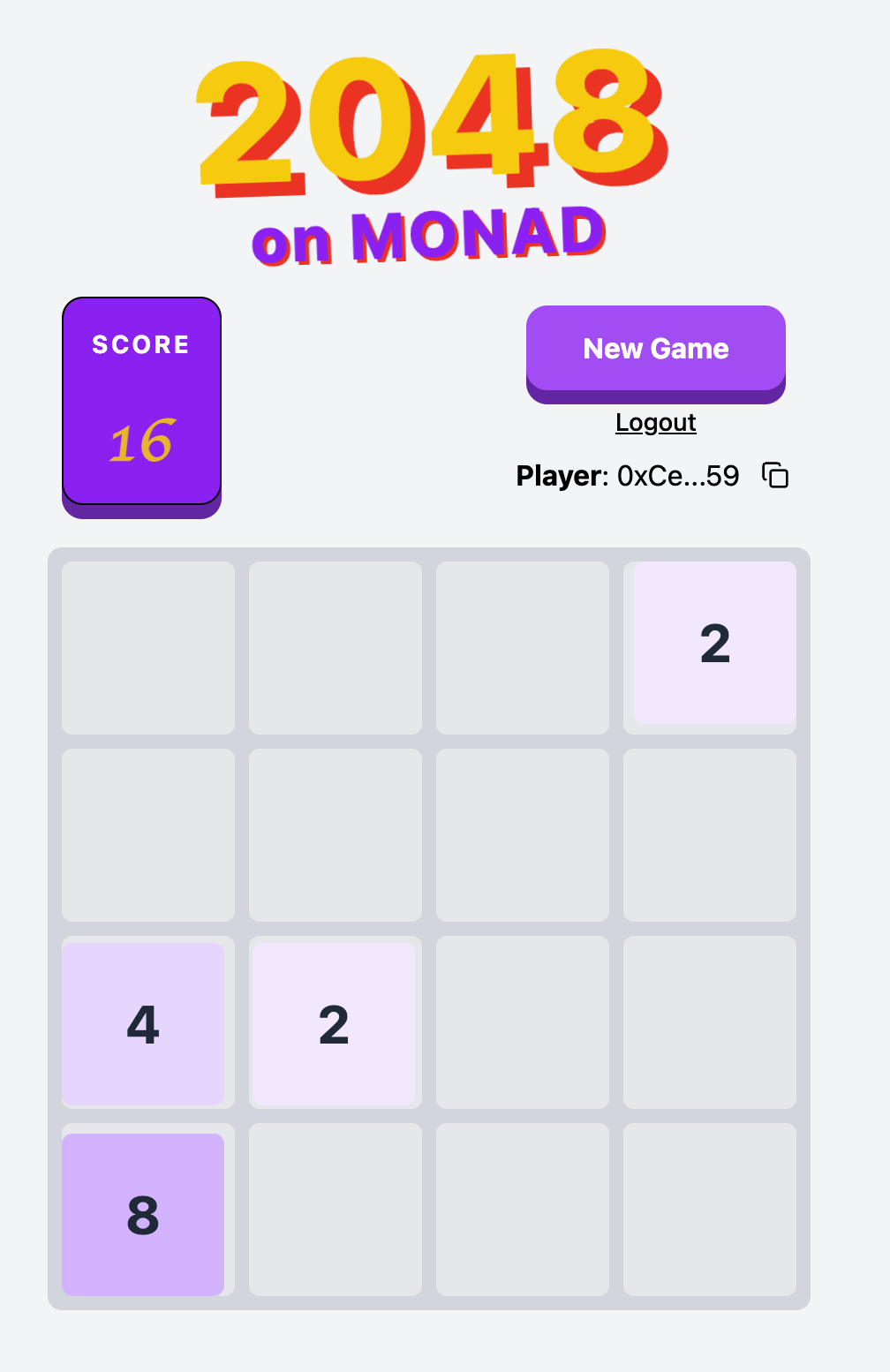 Monad đã công bố một trò chơi mới - 2048. Chúng ta có thể chơi nó và tăng số lượng giao dịch trên testnet. Sau khi kết nối ví chính của bạn, một ví mới sẽ được tạo trong trò chơi. Chúng tôi khuyên bạn nên nạp tiền từ ví chính của mình để liên kết chúng.
