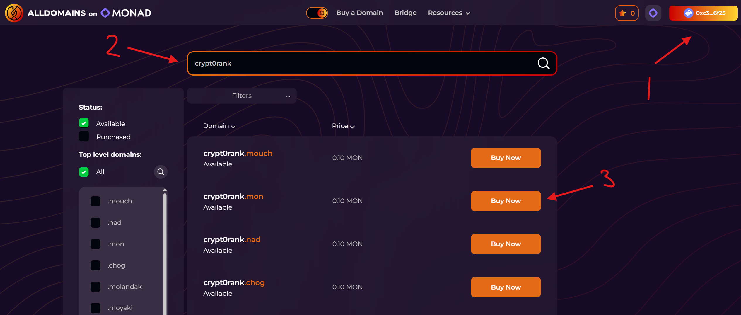 11. Mua tên miền test trên Alldomains. Vào trang web, kết nối ví, chọn tên miền mong muốn, kiểm tra tính khả dụng và mua tên miền bạn cần.