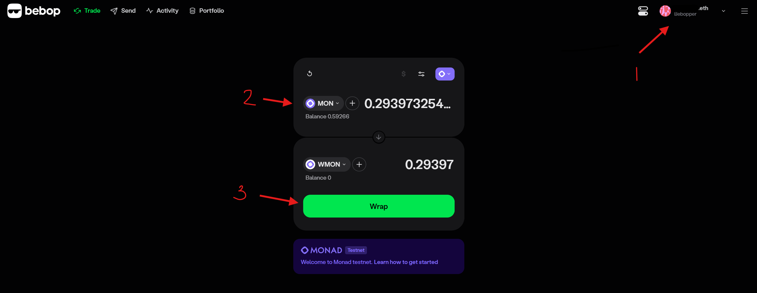 8. Thực hiện nhiều giao dịch hơn trên Bebop. Chúng tôi vào trang web, kết nối ví và thực hiện swap/wrap token test.