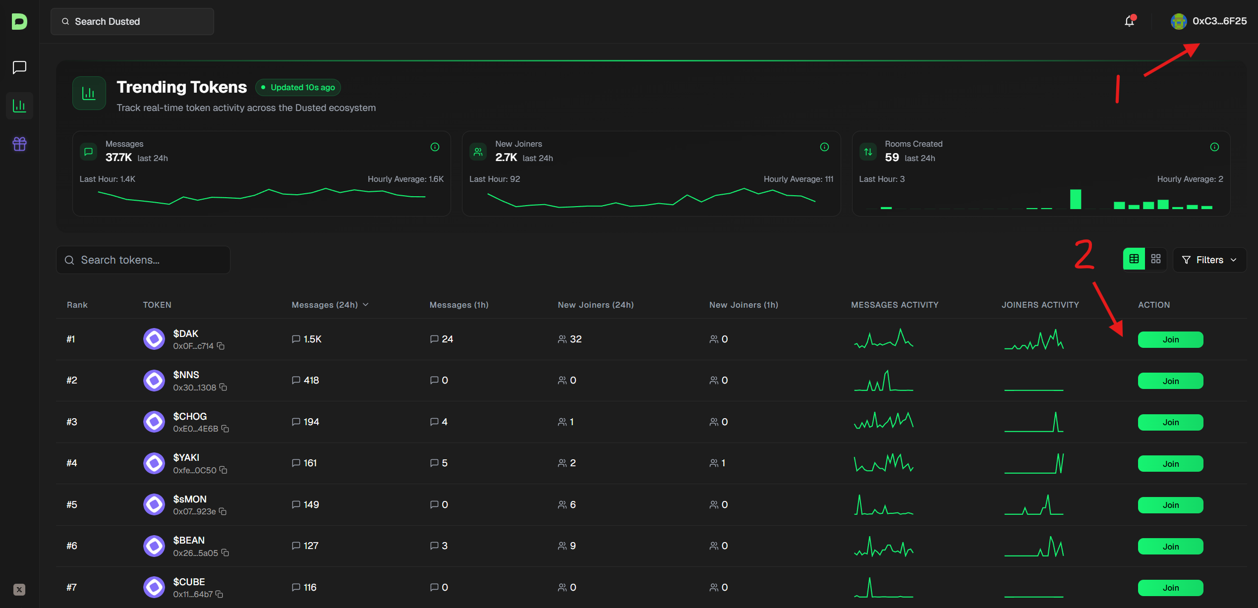 5. Giao tiếp trong các cuộc trò chuyện của các token khác nhau trên mạng test bằng cách sử dụng Dusted. Chúng tôi vào trang web, kết nối ví, mua token chúng tôi quan tâm và tham gia cuộc trò chuyện để giao tiếp.
