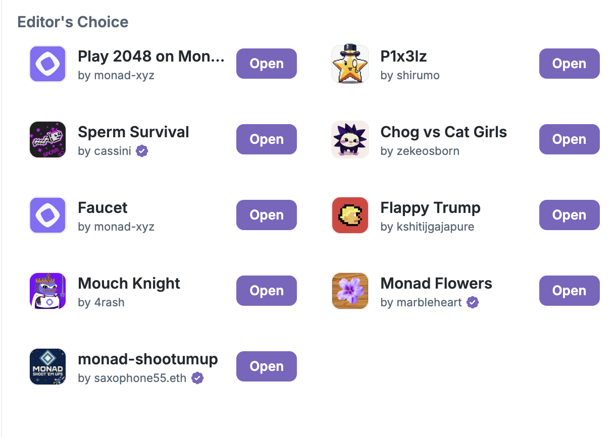 Monad đã công bố một danh sách Dapp mới mà chúng ta có thể tương tác. Chúng tôi nhắc lại rằng chúng tôi đã có một hướng dẫn chi tiết để bắt đầu với hệ sinh thái Monad. Để có được nhiều giao dịch và tương tác độc đáo hơn, chúng tôi khuyên anh em nên làm quen với các dự án khác từ hệ sinh thái Monad. Càng làm nhiều hoạt động và hoạt động độc đáo, càng tốt!