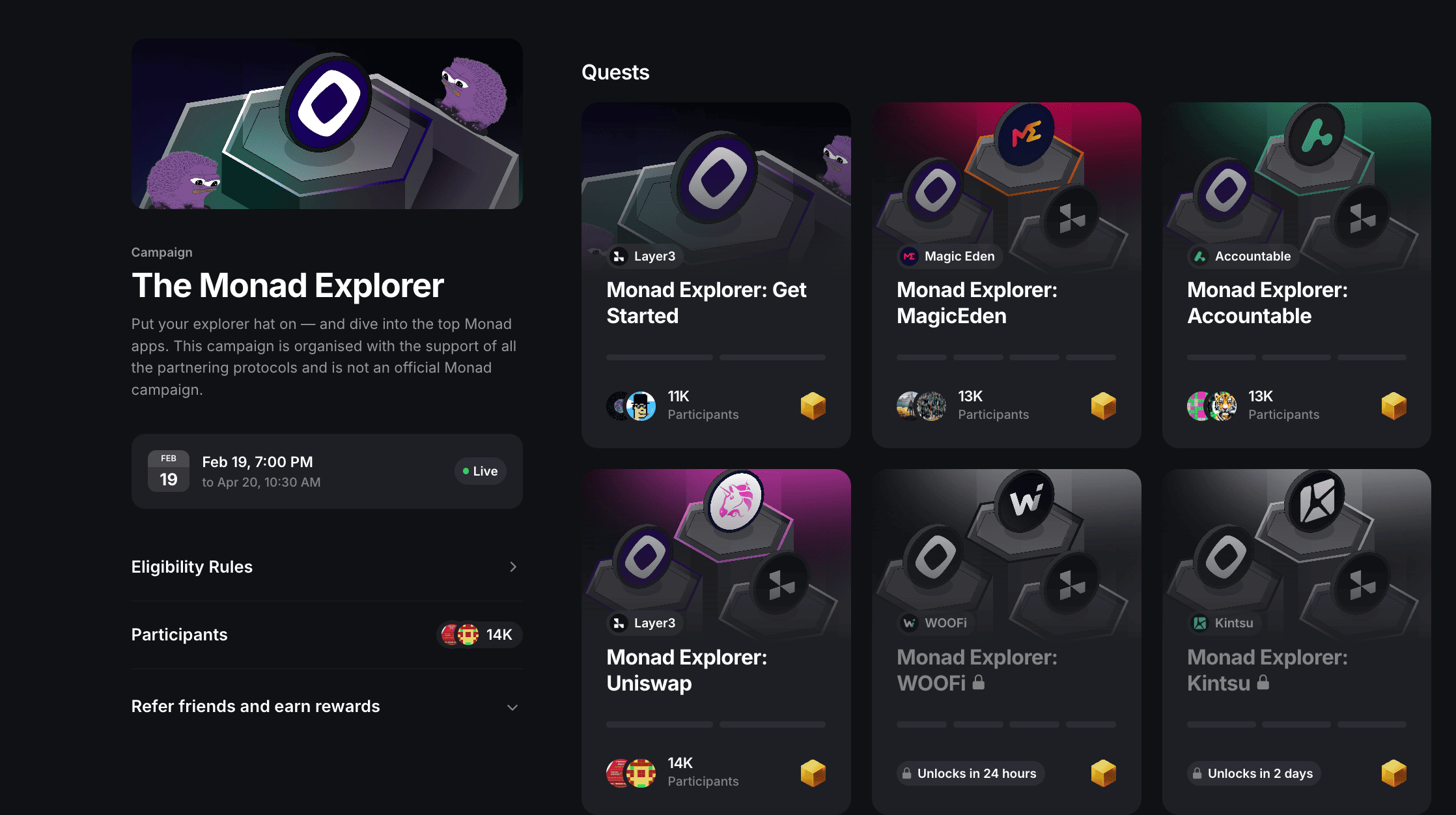 Another activity that will increase your chances of getting an airdrop from Monad is the Layer3 quests. At the moment only 14K users have completed them. This is very low for this level of project.